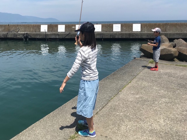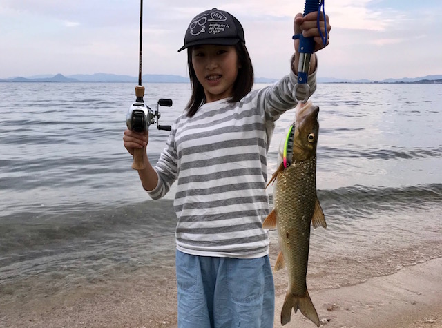 こんにちは。ミワです。この日のお昼にベイトリールタックルのキャストの練習をしにお父さんと弟と近くの漁港に行きました。いつもは管理釣り場でスピニングタックルを使っているので、最初はぜんぜんルアーが上手く飛んでくれませんでした。お父さんに投げ方を教えてもらいながら何回も練習しました。だんだんと遠くの方へ投げることが出来てきたので、夕方に琵琶湖へ行こうとお父さんが言ってくれました。弟たちといっしょに連れて行ってもらった場所は少し波がありましたが水が綺麗なところでした。お父さんに貸してもらったルアー(コトカスミディアム)を投げていると・・・・・いきなりゴゴゴッと強い引きがきて、はじめはどうしたらいいか分からなくてとまどいました。琵琶湖で大きい魚を釣ったのははじめてで、管理釣り場でしか釣ったことがなかったのでとてもビックリしました。最後はひとりで魚を岸にあげることができました。釣った魚はとても重くて50cmもありました。ニゴイだとお父さんに教えてもらいました。とてもうれしかったです!こんどは大きなブラックバスを釣ってみたいです!そしていつかはお父さんが大きな魚を釣っていた群馬のMAVというところへも行ってみたいです。