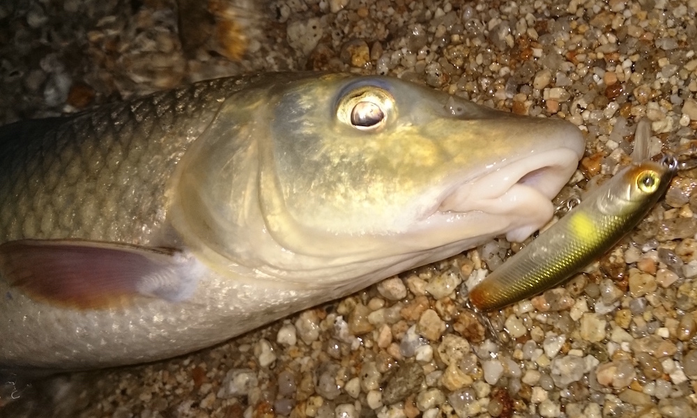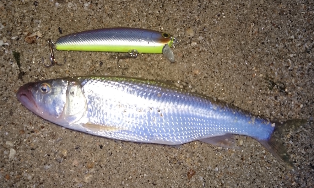 失礼致します。いろいろ起こっていますが今私に出来るのは、通常通りの生活する事。なので台風も過ぎてどうかなと思い行ってみました。地形も随分と変わっており、ウィードも飛ばされてしまった模様。水際にはちらほらベイトの姿。凪なので沖のボールがあっち行ったりこっち行ったりしているのが見えるも、届く処までは寄って来ません。たまーに届く範囲でボイルが起こるものの単発のみ。Jr.をぶら下げ、次に起こりそうな処を投げずに観察しているとニゴ様が寄っているのが見えたので取り合えずサミングでのサイトで1尾。よく走ってくれてこれも楽しいです。が、取り込んでいる最中に沖で吸い込み音。ウーン。だいたい同じ場所で捕食しているみたい。ならば、とJr.に戻してなんとなく感じた処へ投げ2MくらいスケーティングさせたところでジュボッとJr.が消えました。しばらく潜られましたが、藻化けの心配は無さそうなので慎重にやり取りし無事確保。54センチくらいの歯の鋭いサカナでした。その後は同じように出ないかとあちこち投げてみましたが、夕刻からハスとニゴイが連発して終了とあいなりました。また行ってみます。