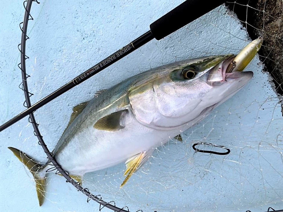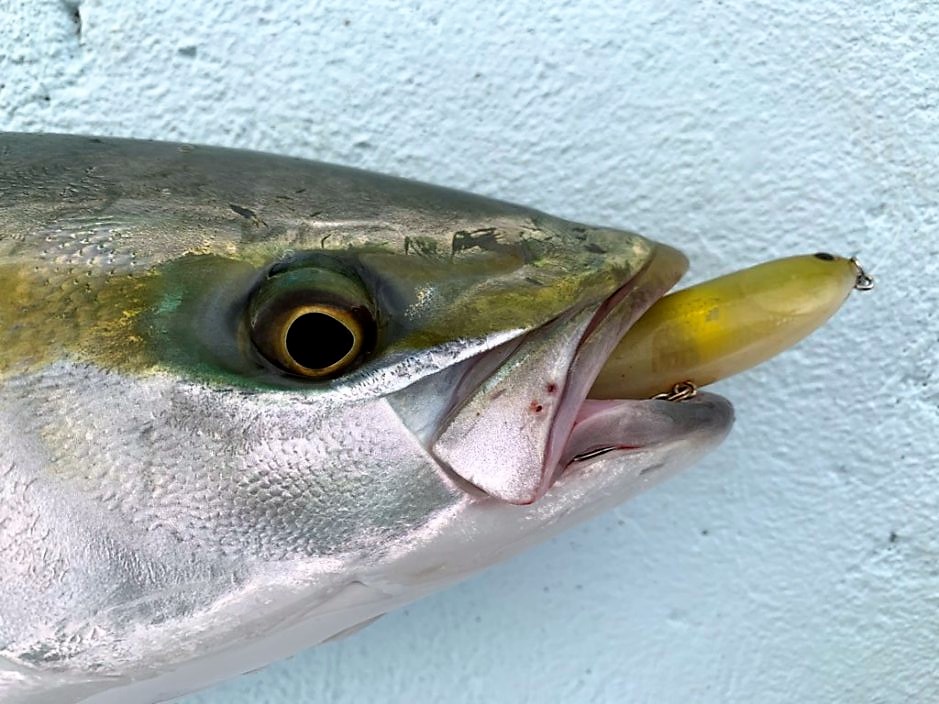 私の青物狙いは、基本的に自宅近辺の海水浴場というのんびりとした状況で、いつでも時間ができたらちょこっと行ってみるスタイル。昨日、ファットサムを豪快にひったくっていった魚は、竿を立てることもできず根ズレで完敗。ツバスでも釣れたらいいやとチヌ狙い用のライトタックルだったということもありますが、何よりも溺愛しているファットサムを持っていかれたのは大きな痛手でした。そして、今日の夕方は青物の引きに耐える強いタックルで再挑戦。1投目、ファットサムに水柱を立てたのはツバス級、これは抜き上げる時にフックアウト。気を取り直して、ファットサムをゆっくり、しかし左右にキュッと動くようにアクションさせていると、再び豪快な水柱、波紋が消えるとファットサムの姿も消えていました。渾身のフッキング!ガッチリとフックが刺さっているようで、首を振りながら突進していく動きがはっきりと分かります。数分間、引っ張り合いをしてようやく玉網に収めることができました。実は今年の令和元日にもファットサムでこのクラスの青物をヒットさせながら口切れでバラしていたので、これが令和初の私の青物釣果です。