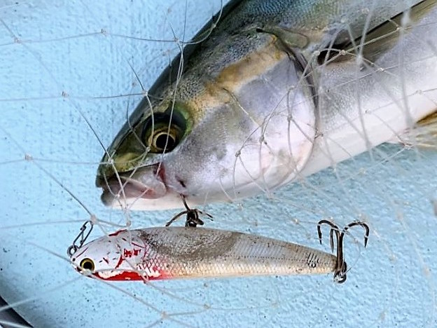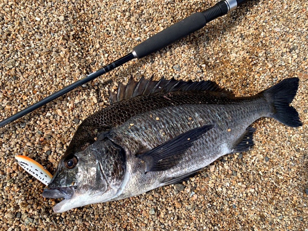 さて、入手したての新しいファットサムで久しぶりにトップでチヌ狙いのレポートです。本日、長女の全淡路中学校総体で軟式テニスの試合があって、応援に行っていました。決勝リーグに進出したタイミングで、決勝まで時間が少しできたので、会場校近くのサーフへ。実は例年実績を挙げているホームグラウンドなので、ある程度チヌの出るスポットは理解しています。テンポよくファットサムをキャストして探っていきます。沖に頭を出しているシモリの横を通すと、銀色のギザギザに尖った背びれが迫ってきたかと思うと、水面が派手に割れました。今季、淡路島全域チヌの調子はよくなかったようで、私も今年はまだ2匹しか手にしていない状況ですので、貴重なヒットです。身が分厚い良コンディションでしたので強い引きでしたが、何とかズリ上げて取り込むことができました。ファットサム、ほんまに対象魚を選びませんね。さらに夕方、先週メジロが釣れた場所へ。ファットサムを使えば、魚が居れば食ってくる妙な自信がついたので、最初はサンプルを投げていたのですが、やはり水面にとどめておく方が夕方は反応よさそうなので、ファットサム(PS)に替えて水面をゆっくりとドッグウォークさせていると、やはり水面が割れました。40cmほどのツバスなので、ライトタックルでもファットサムを取られることなく取り込むことができました。
