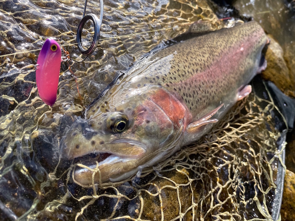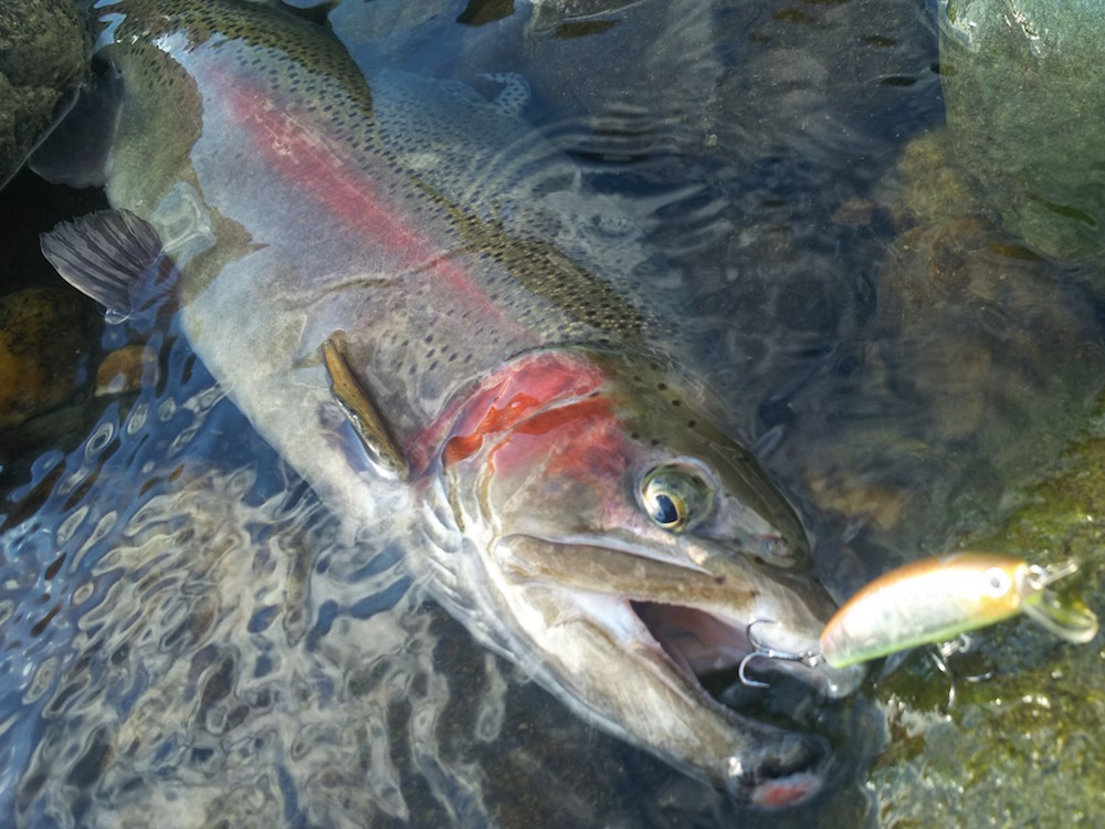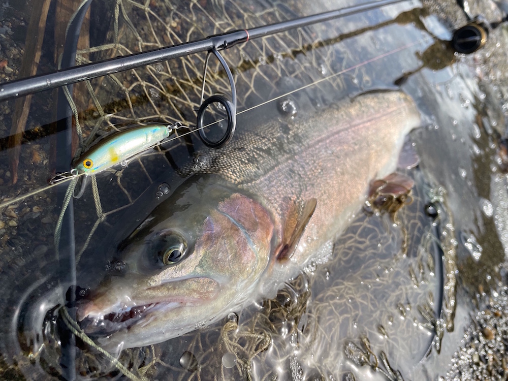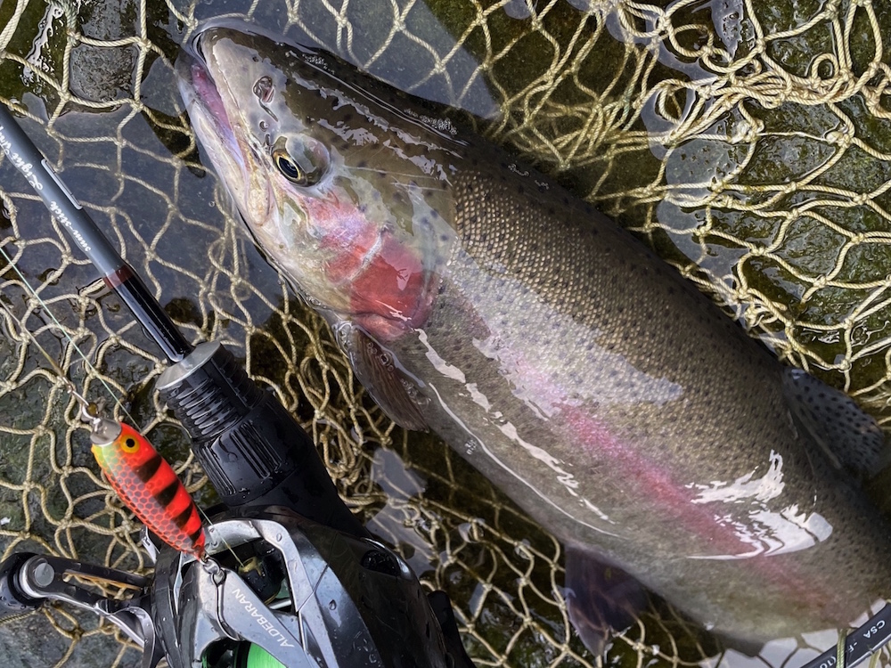 今回は凄腕アングラーKAZU氏にガイドして頂く安心釣行。上手いアングラーとの釣行は非常に勉強になるし刺激になるし得るものは大きく非常に楽しみだ。今日は放流日なのであるが、そんなの眼中なく狙いは一択、居着きのワイルドレインボーだ。まずはKAZU氏にレクチャー頂き二人でパターンを探す。するとKAZU氏がバイトをとるが残念ながらフックオフ。これでパターンが判明。早速再現するとアップクロスで打ったプロップドロップ(チューン)にレッドバンドが鮮明なレインボーが表層で食らいつく。しかしこれまた反転一発でフックオフ。ワイルドなヤツはやはり一筋縄ではいかない。すると下で釣っていたKAZU氏がサミング50cwで技ありキャッチ。思ったより魚は上ずっている。自分もサミング50cwにチェンジし岩盤のスリットを丁寧に流すと強烈バイト。ガッチリフックアップさせるが全く動かない。しかしファイト開始すると一気に走られ痛恨のラインブレイク。これはデカかった。懲りずにサムバイブミニに変え同じラインをトレースするとやっとの一匹を無事キャッチ。そうコイツらは既に放流魚とは別モノ。管釣タックルで舐めてかかっていたのが苦労の原因だ。休憩を挟み今度は大好きな瀬打ちに狙いを変える。細かい流れの筋をS45cwピンポイントにトレースしているとサイトでチェイスを確認。上手くバイトに持ち込み落ち着いてキャッチしたのは完全回復に近しいスチールヘッド化した納得の魚。これは本当に嬉しい一匹だった。締めは放流魚をプロップドロップミニ一撃でキャッチし納竿とする。一端の悔いが残るものの大変楽しい時間を過ごせた事に満足。そして帰路、70目指してちょっと通ってみようかなと思うのでした。