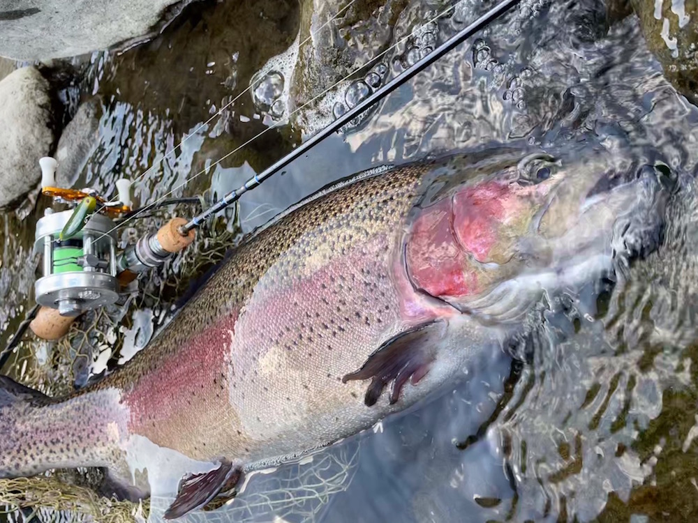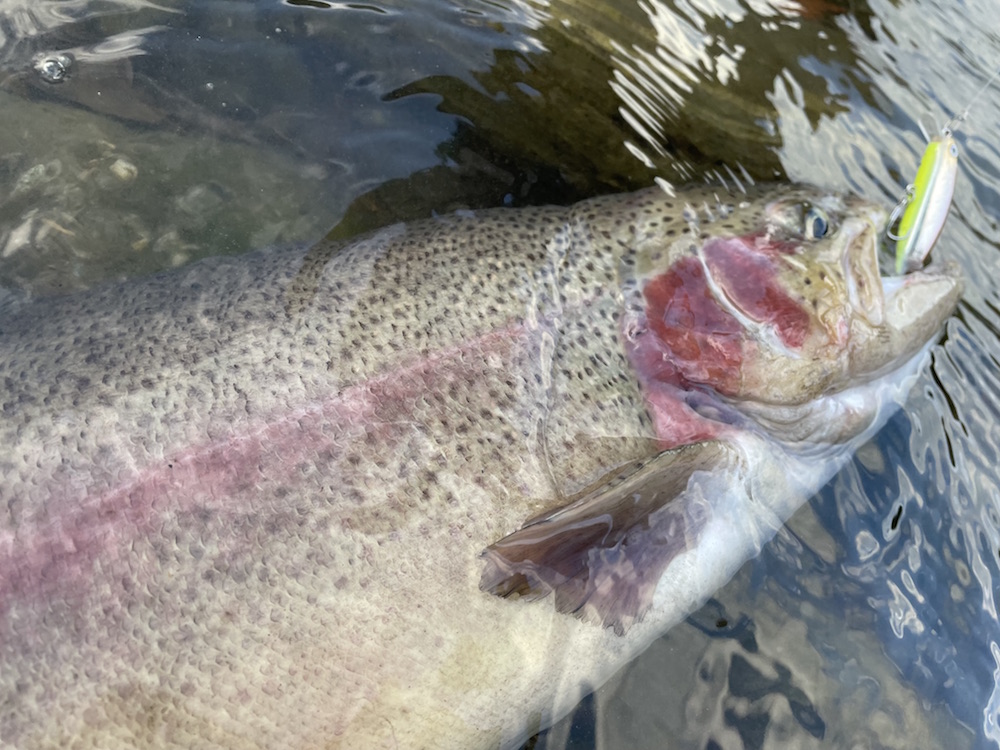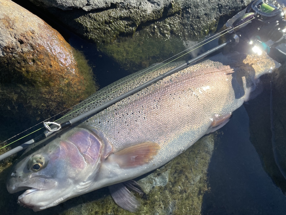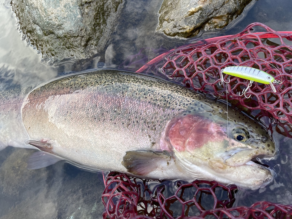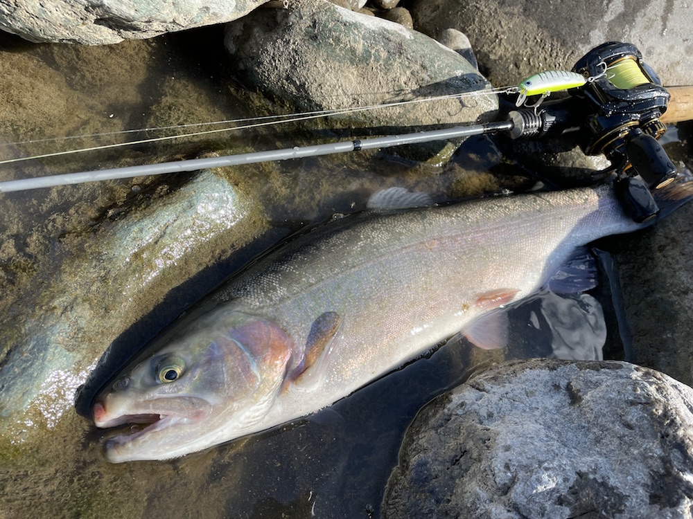 昨年良く釣れたもんで甘く見ていました。今年は打って変わって激渋でした。夏の災害級?の増水の影響か、それとも現在の渇水の影響か、はたまた上流のダム工事の影響か・・・決して放流魚のみを期待した遠征だった訳ではないですが、ここまで釣れないとは思わなかった。決して漁協さんの怠慢によるものではありません。通常放流魚は水に慣れるまで動きが悪いもんですが、一晩経っても動きが鈍かったのには、何かしら魚にとって辛い条件下であったことは間違いないでしょう。でも、昨年のKAZUさんによるレクチャーを受けただけあって、年越し居残り?のワイルドなレインボーを何本か釣らせてもらいました。今年は渇水しているだけに尚更サムルアーズ達の存在も生きるというもの。僕のローテーションで良い仕事をしてくれたのはサミング50cwとサムバイブミニSS。天竜川ではスプーンをご使用のアングラーが多いですが、プラグの方が向いてると思うな、そして面白い。唯一の心残りはプロップドロップで釣果をあげられなかった事。あ、いや、プロップドロップが得意とする所で使えてなかっただけかな?とりあえず来年も遠征するのは決定です。現地での車中泊も楽しいしね!