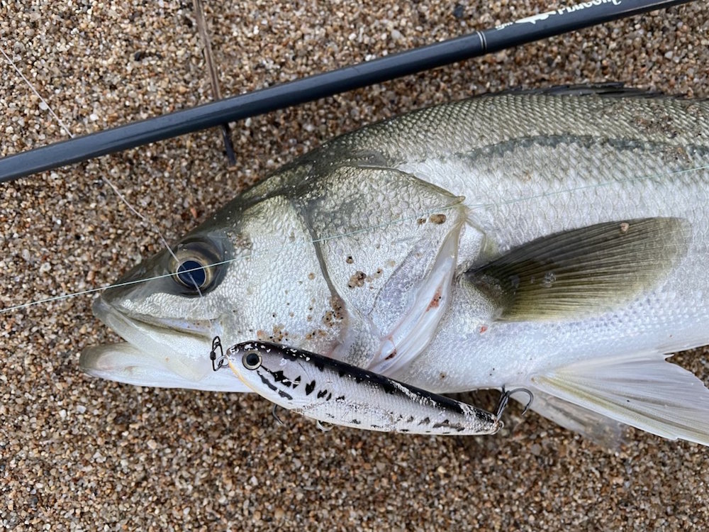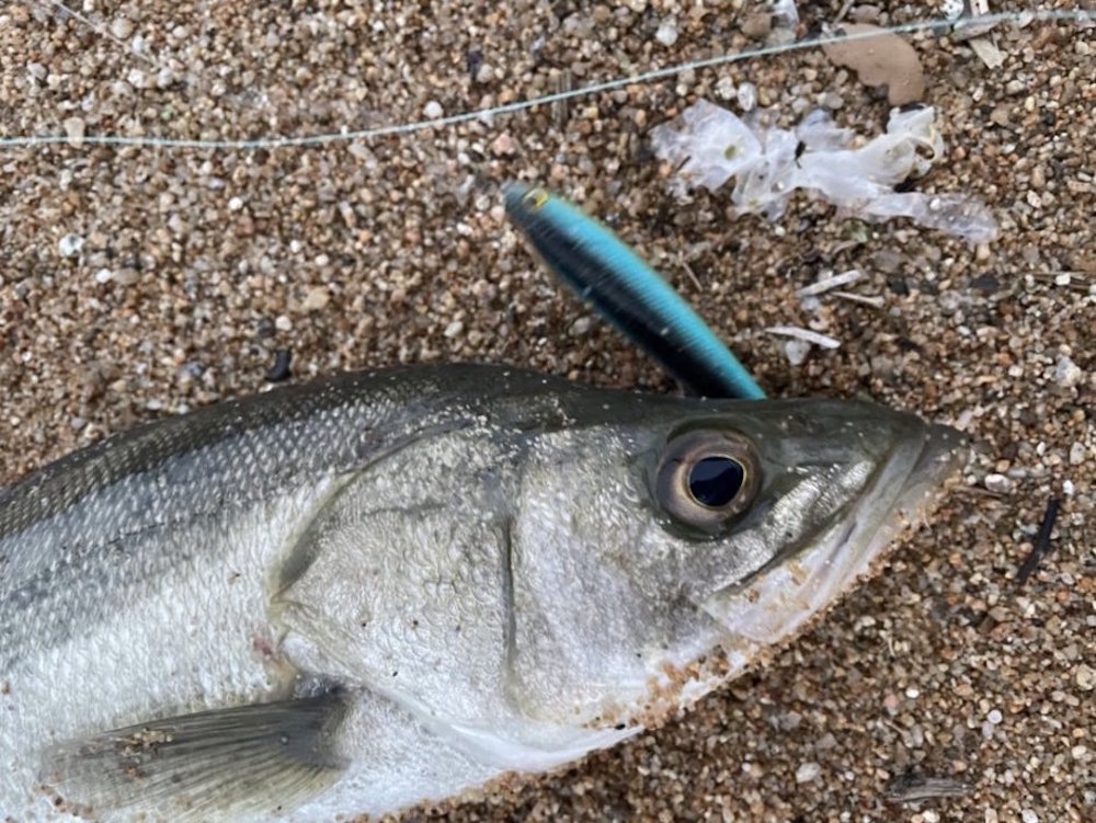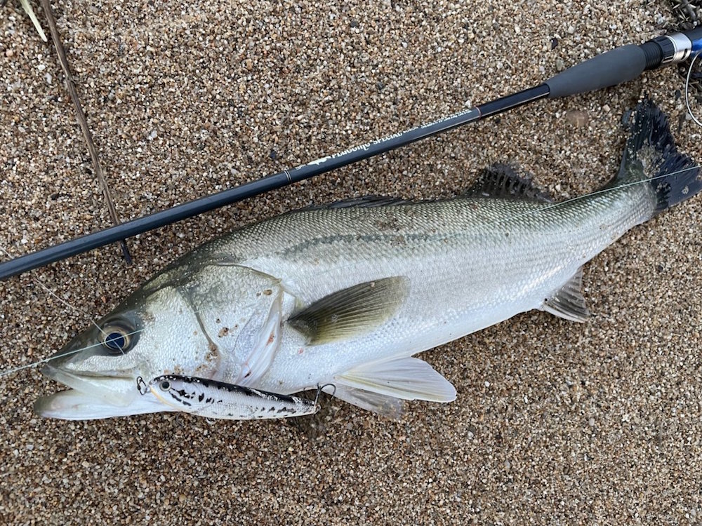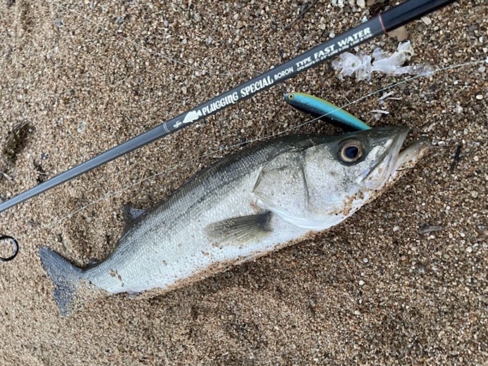 大変ご無沙汰しています。ご無沙汰・・・つまり釣れていなかったということで。言い訳すると先月はほとんど餌木でイカ狙いをしていました。台風の影響で、朝に集中的に大雨が降りました。このまま晴れずに南風が残れば夕方は有望なのですが、今年の調子の悪さを象徴するかのように午後から太陽が顔を出し、風もピッタリ収まりました・・・。今日は、夕方に時間を作ることができたので、河口サーフのいつもの場所へ。ベストタイミングは2時間ほど前の干潮時でしたが、濁った水が流れ込んでいるのでチャンスは残っています。が、しかし。食い気の立つタイミングが過ぎて明るい状態だとルアーを見切るのか、反応はありません。時間が経てば経つほど条件は悪くなるのですが、夕マズメのローライトで一瞬活性が上がるかも、と判断して待つことにしました。台風の影響でややウネリがあるので濁りは申し分なし。日没を迎え、辺りが少し暗くなってきたタイミングで、遠投していたファットサムにイルカショーのように全身を躍り上がらせて抑え込まれました。ずいぶん引くので、もしかしたらハマチか、と思いましたが引き寄せるとフックが口以外の場所に掛かっていました。口に掛かっていたフロントフックが外れて腹に刺さったからのようです。57cmのセイゴサイズですが、マルスズキはものすごく久しぶりです。波打ち際でもう1匹追加して終了。今回の判断は、ベストではなかったのですが結果が出たので安心しました。