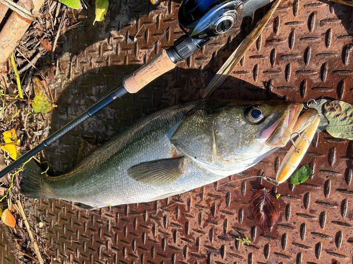 こんにちは。台風一過はスズキ釣りのチャンスです。猛暑と降雨がなかった状態から、一気に増水して条件が整うのはほんの数時間。潮位も勘案するともっとチャンスタイムは限られます。小河川の堰はギリギリ潮位があるので、チャレンジしてみました。対岸ギリギリにファットサムを落とそうとしましたが、少しミスって狙いよりも手前に落としてしまいました。回収して撃ち直すか、そのまま引くか。狭いのでそのまま引くを選択。グイッとファットサムの頭を捻らせるとゴボッと水面が割れました。65センチの銀色に光る個体でした。河川のあちこちに定着している個体は真っ黒ですが、これは増水で餌を食いに沖から入ってきた個体です。