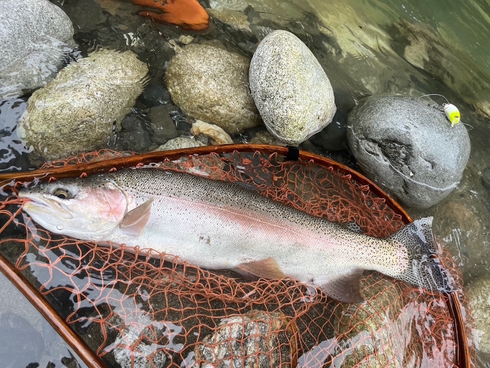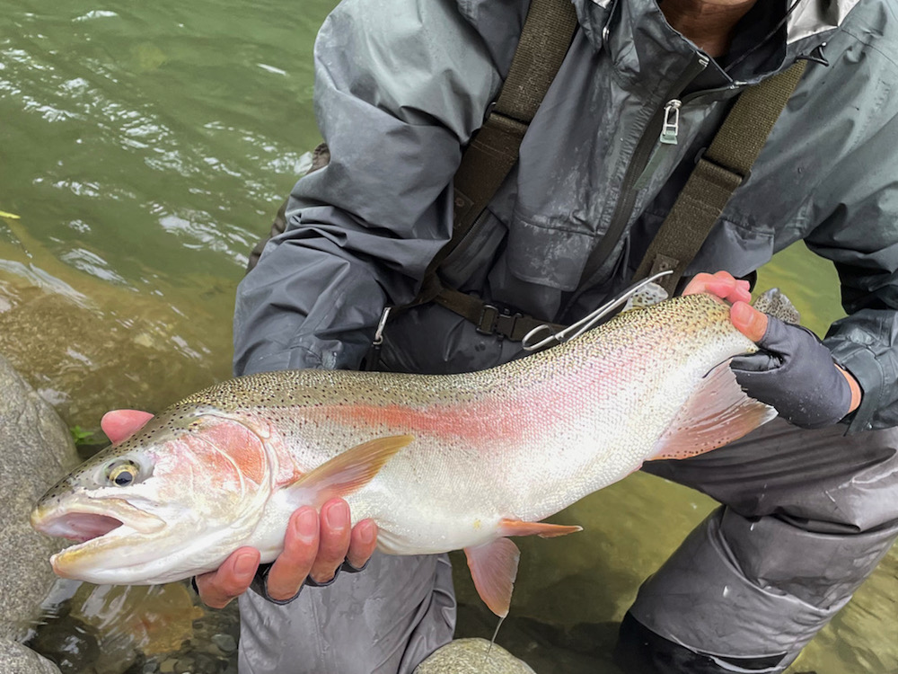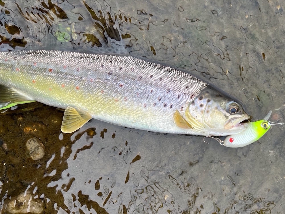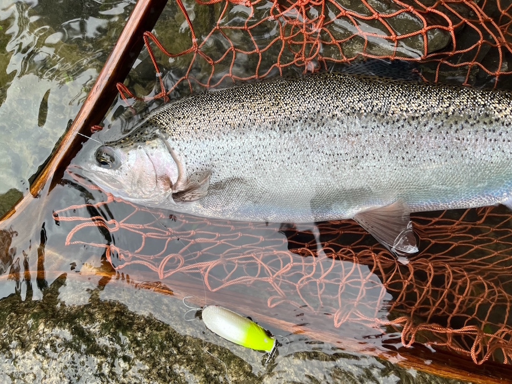 去年も道東に来ていました。その時は雨が降り続くタイミングとかぶり、濁りの少ない川でしか釣りができませんでしたが、沢山釣れるニジマスや、足を伸ばしてわざわざ熊に怯えながら釣ったオショロコマなど、普段味わえない釣りを楽しみ、夜は長年の友人M氏、Y氏(もちろん釣り人)との飲みで1日を締めくくるという、釣り人のお正月のような日々を過ごせたことが何よりの幸せでした。京都に戻り、そんな日々を反芻しながら暮らしていたとき、M氏から送られてきたのは60cmを超えるワニのような顔のニジマスの写真でした。この写真によって、北海道の釣りで自分が望んでいた「60アップのニジマス」というものを思い出しました。北海道のニジマス釣りでは一度大型を逃して以来、小型の専門家となって17年が経ってしまっていたのです。そして、18年目の今年、ありがたいことに再び道東で釣りをする機会を得ることが出来たのでした。幸いどの川も濁りがなく、どこでも釣りが出来る状態です。まずは去年入れなかった本流、10年以上前に正体不明の大物をバラしたポイントから始めることに。バラした深場は早瀬になっており、月日の流れを感じます。ちょっと肩透かしくらいつつ、何となくサミング70を投げていると、瀬尻に差し掛かったあたりで割と強いアタリが、そしてウグイ以上、ニジマス以下の引きに、何が釣れたんだろうと思っていると、姿を見せたのは35cmくらいのアメマスです。この引き思い出しました。なつかしい。嬉しい。最近この水系ではめっきり数が減ってしまったそうです。そのまま釣り下ると、流心では時々背鰭を見せたり跳ねたりしている魚がいます。多分、鮭です。しばらくすると扇状にゆっくりと引いていたサミング70がダウンに差し掛かった時にさっきより一回り小さなアメマスが来ました。その後日差しがきついくらい晴れ始め、アタリもなくなってきた気がしたのでポイントを変え、ここでも早瀬から開きを狙います。今度はアップに引いてきた赤いサミング70に小さなニジマス、ダウン気味のチャンクでブラウントラウトの30cmくらいのが釣れ、その後支流でめちゃ小さいヤマメ、4目釣りを達成し、小型専門家の仕事を全うして1日を締めくくりました。2日目は雨模様、雨男としては動じることなく、しかし、午後からのM氏との釣りに備えて、控え目に本流でボウズ。いよいよ、今回の本命の川に向かいます。何故か本降り。しかしいつもはクリア過ぎるこの川にはプラスに働くかもと前向きに2台の車は走ります。そうです、広範囲を通して釣るため2台で行こうというM氏の提案です。到着した川は釣りはなるなと言うくらいの濁りですが、ここを通すことに決め、去年訪れた時は白濁りで釣りというよりも危険な状況だったあの川を釣り上がります。もちろん雨。濁りはちょっときつくなって、増水で川渡りもなかなか大変。しかし、それがチャンスとポジティブにキャストを続けるも、ノーチェイス。反応のないまま進むと、強烈に濁った沢が流れ込んでおり、その上流からは、釣り人なら誰もがちょうどいいと思える水色になっています。その後、群れるサクラマスに遭遇したあたりから、釣り人なら誰もがなんか良さそうと思える雰囲気が漂い始め、次の淵で突然チェイスが多発します。ルアーはチャンク。魚は小さいのですが、こんなにチャンクを追うとは、やっぱり北海道なのか、よくわからないが普段の川とは何かが違う。とはいえ、なかなか乗らず、サミング50でやっと釣り上げることが出来ました。小さいけれど、この川のニジマスは美しい。そして、次の淵、手前の岸よりでポコっと頭を出すかなり大きな魚を確認。今日みたいな水量の時は普段の付き場は流れが早くて、大きい魚はゆったりとしたところに居ると思う、というM氏の言葉通りです。季節的に増水すると沢山流れてくる落ち葉が煩わしく、さらに岸よりに着いてるのかも。サクラマスかも知れませんが、そこを通るようにチャンクをアップに投げて2投目、白く光るチャンクに食いつく大きな魚影を目撃、というか釣れてる?サクラマス?ほっぺた赤いしニジマス?自分とそれが糸で繋がってることに動揺しながら、M氏に伝えます。60アップを狙ってるはずの自分のネットは小さい、バラしたくないので迷うことなくM氏にお願いする。見事ネットに入ったのは、凄すぎてまともに見れないくらいのニジマス。いつのまにか雨も止んでいる。まじか、すごい!くらいの語彙でしばし鑑賞、撮影の後、何よりも体力を使った魚の蘇生を優先させるM氏の的確な対処で、無事流れに戻すことが出来ました。もう十分、これ以上は望まないと言いつつ、使い続けるチャンクに食いついたのはめちゃくちや暴れる40cmくらいのニジマス、ジャンプしたと思ったら、猛ダッシュ、全力でニジマスと言う魚を教えてくれます。アップでグリグリ巻いたら迷いなく食ってきました。次はアメマス、まさかのヤマメもチャンクに食っ