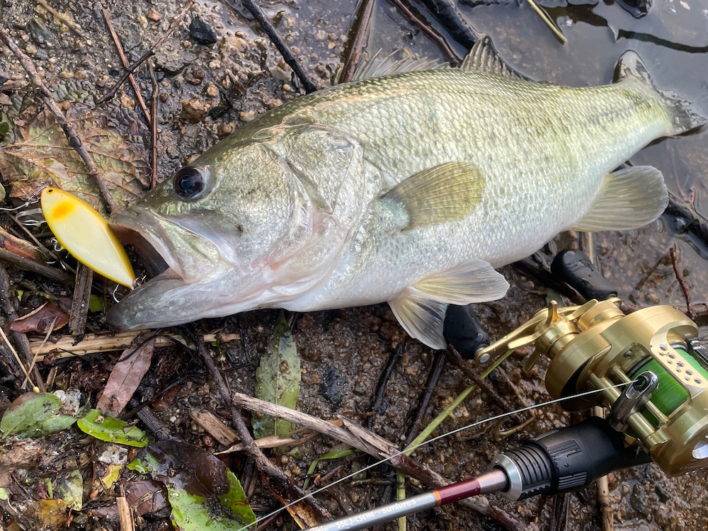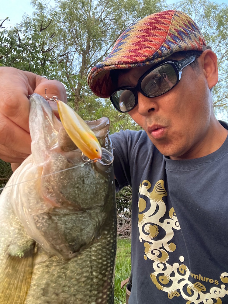 今シーズンこれまでに何度(片手で足りるほどですが・・・)かチャンスは有ったもののバスを手に出来ておりませんでした。この日はまたサム山岡と二人で釣行。午前中の情報を漬物石さんに聞くと芳しくなかったとの事で、まぁ8割がたノーフィッシュ?!の予想。兎に角フィールドに着いたら一帯を歩いて回る事から始める。入れ替わり立ち替わりアングラーが入っている様子なので、何となくタフなその雰囲気は感じ取れる。ただ、今日は日暮れ時をメインに考えていたので、焦らずノンビリ。さて、山に陽が沈み始めた頃か、何となくシャローに魚の気配を感じ始める。もしかすると鯉かもしれないが、どうもバスくさい。狙いは岸際中心だが、魚が動き出したら沖目も有り得る。歩き回った感じで狙いを数ヶ所に絞る。狙いの一箇所は先行者が重装備で貼り付いている・・・この雰囲気は以前に良い思いをしたに違いない。時間を空けて他を狙っていると先行者は納竿した様子。チャ〜ンス!セレクトしていたアイテムは二つ、サミング70Fnatのスローライザーチューンとフナミノー。狙いのシャローを引くにピタッとはまってる感じなんです。放射線状に狙って行くと少し沖目に水面の動きを察知。すかさずフナミノーをキャストし、クルクル、クルクル・・・フナミノーのレンジなら何も障害物に触れないのは確認済み。そして間違い無いアタリが発生!完璧!あ、すみません、格好つけてますが、恥ずかしながら初バス。サイズもちょっと控え目にギリ40UP。さて、トラウト釣って、バス釣って、次はアレかな・・・