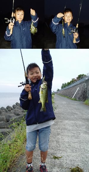 | 間際になっての予定変更で、接待フィッシングパート2に息子ものっかり、日曜日の仕事をすませ21:00琵琶湖へ向けて出発「早く早く」と待ちきれずの出発だったのでのんびり下道を・・・朝まずめは二人の面 倒をみないといけないのでせめて夜中は自分の釣りがしたくて湖西1ヶ所目へ1:00過ぎに到着。エリポイントには既に2 人、浜を移動している人1人、 少し離れてエリよりちょっと北へ。Mプロ、cotocas-M、ダイビングサム70CWで攻める。Mプロにジョボ、クンッと触るようなバイトを逃し沈黙が続く。その後ダイビングサム70CWのただ巻き中に音もなく、いきなりロッドがのされフッキング!・・・しようにもいきなりドラグを出され、慌てているうちにもう一度“ウ〜ン”とドラグがなる。“ヤバイ、ドラグ締めてフッキングしなきゃ”とドラグに手をやるとかなり締めた状態に焦りと体が一気に熱くなるのを感じ、またドラグを出されて・・・フッキングしたつもりが、一緒にドラグも出ていたのでしっかり出来てなかったのか、ウウッっと短い音の後・・・エッ一人ぼっちのダイビングサムを回収するとリアフックが少し伸び、鱗が2枚お土産についていました。(うちに帰って定規と記憶を辿ると直径1cmはありました)フックについていたわ けじゃなく何故かルアーにペタッと張り付いていました。その後流れ込みを見て某河口で4:15まで投げましたが1バイトに終わり、子供と嫁さんがやる為に足場の良い所へ移 動。息子はダイビングサム70CW、嫁さんはMプロでスタート。嫁さんと息子のロッドを交互にキャストしてやり、いきなり大忙し・・・少し明るくなり始めたかなというころ、息子のダイビングサム70CWを投げ、ロッドを握らせ糸ふけをとるのを手伝っていると、いきなりプルるんとアタリが。ロッドを押し上げフッキングしてやり一人で巻かせる。手に伝わる振動を感じながら一生懸命巻いていると途中から「重い、巻けない〜」とSOS。手伝ってやるとウィードに隠れた可愛いギル。なんだギルか・・・と思っていると、息子にはそんなことは全く関係なく「初めて(ルアーで)釣った!」と大喜び。全く同じ様に直ぐに2匹目。ウィードか?と思ったら奥底から申し訳なさそうに バスが顔を出した。初バスにホッとしたがこのサイズでは・・・ と思っているとまたもやそんなの関係ないとばかりに「2匹目ゲット!」と大喜び。あまりの喜びぶりにこちらまでうれしくなってしまいました。ちょっと南下してまた糸ふけをとって今度はこうやってチョンってやってごらん と動かすといきなり“グンッ”とちょっとましな手応え。大きいぞ!巻け!と巻かせると直ぐにウィードに潜られてウンともスンとも巻けない状態に。「巻けない〜」ロッドを取り巻き上げると まだ付いてる!ウィードを取り魚をみせると「で〜っか!」これには大満足の様子。写 真を撮る時も「(ラインが)滑る〜滑る〜」といいながらニコニコ顔・・・7:00ちょっと前に日が出てきてしまったので終了。よかったよかった!片付け中も「やった〜友雅3匹もゲットした!ママは?」 「・・・・・・」全くその問いに深い意味は無いんでしょうけど・・・またもや初バスお預けのママでした。なんだギルか〜なんだ子バスか〜と釣り上げた魚をみてガックリしてしまう今ですが、子供の喜び様をみていると、野池で自分が初めて釣った20cm 位のバスを思い出して懐かしい気持ちになりました。やっぱり釣りっていいですね。この子の子供の代まで琵琶湖で釣りが出来るように少しでもやれることはやっていかないといけないな・・・と思いました。 | |||