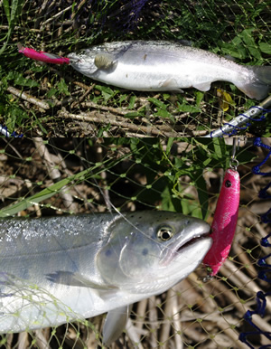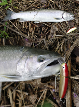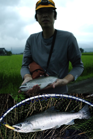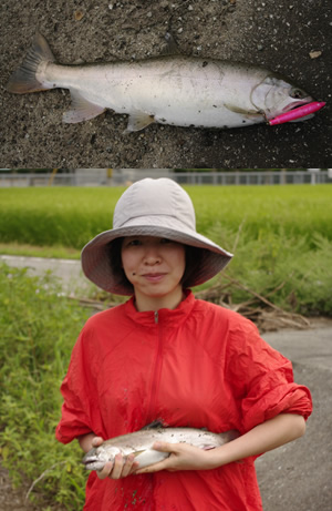 | 猫に留守番をしてもらい8月21日夜に今回はヒグマのいない富山へ出発。 用水路巡りに行って来ました。22日朝、到着してまだ私が寝てるあいだにYOさんとNOくんはヤマメ(39.9センチ)とイワナ(38.5センチ)釣っており、目が覚めてみたら、すでに台所でさばかれ美味しそうな姿になってました。その日のお昼は前日の雨が影響して、だんだん水が濁りだし、用水路は休めてちょっと海で地元の方の釣りを伝授してもらいまあまあ釣れて、少しテンションを上げ、次の日の早朝のマスを狙う為に就寝。早朝、昨年の秋に用水路で魚の跳ねるのを発見して以来、約1年間、待ちに待ったマス釣りで、気合いを入れて用水路へ。少しはましになったものの、まだかなり濁っている状態で、ちょっと落ち込みあきらめつつも、NOくんのタックルを借りて何度かキャストを試みる。 まったく魚のいる気配なしで、水中も何も見えないので、かなり不安になりながら、少しずつ場所を変えて、ルアーもピンク色のサ ミングにかえてもらい、何度か粘り強く投げてみると、やっとドカーンとアタリがあり、良くわからないまま合わせて、心配なのでもっかい合わせて、リールを巻くと、なんと大きい銀色のマス(38.5センチ)が しっかりルアーを食べて釣れていてました!その後ちょっと一休みで睡眠し、NOくんは、私の釣果 に触発されたのか、凄い日照りの中1人、カメラとタックルを持って用水路 へ。30分くらいして「いい釣り方を発見した」と笑顔で満足げに戻って来て、カメラで釣れた二匹のマスの写 真を一緒に鑑賞。YOさんはその間、富山のどこかでアブに襲われながら、別々の場所で釣り。再び、所用で用水路付近へ戻ると、YOさんが用水路で釣りを楽しんでおり、合流。濁りはだいぶとれて、ちょっと釣れそうな気配。YOさんがヤマメを釣りたいとのことだったので見守ったけれど反応は無し。 釣りって難しい!と思いながらも、今回はいい魚が釣れたので満足して、猫たちが待っているので家路につきました。 | |||