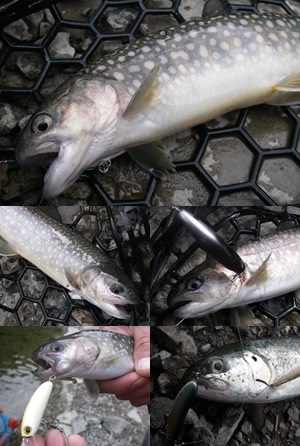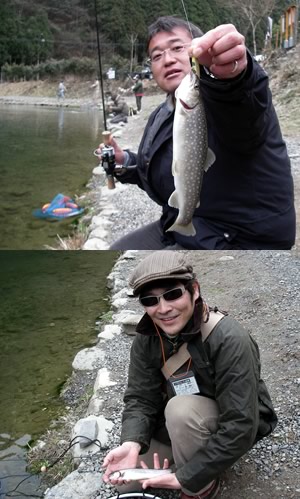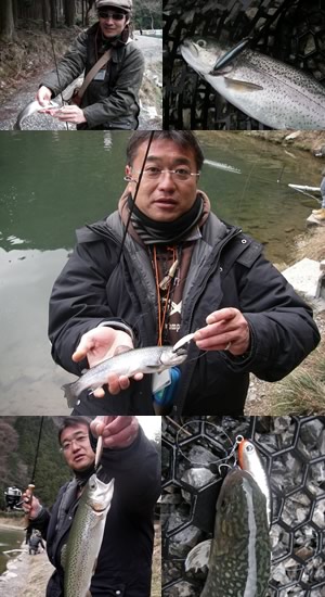 | 北関東で宮城アングラーズヴィレッジを知らないエリアマンはもはや“もぐり”!って事はないにしても、かなりのメジャーな管理釣り場である事は間違いない。本日は何を隠そうそちらの“ボス”こと井上荘志郎氏と関西の管理釣り場事情の視察という名目で出掛けてきた?いえいえ今回の釣行は神戸での仕事の前に京都に立ち寄っての半分プライベート的な釣りな訳でして、実は前日、井上氏も常々気になっていたという琵琶湖のビッグバスフィ−バーを体験しに噂の湖西へと向かいましたが・・・それはもうひどい悪天候で、風は強いし雨は降るし気温は一気に下がるわで、二人して凍えた体を丸めて退散いたしました。ただ、そんな状況でも気配はムンムン、捕食音は3回確認。うまくタイミングさえ合えばまだデカバスは釣れますな!で、本日は午後から朽木渓流魚センターへと。僕の目的はやはり“関東の釣り”と言うよりは“井上氏の釣り”を間近に見てみる事にあります。井上氏は関東で管理釣り場を経営しつつもマイクロスプーンは数年間使用していないとの事。普段主に使用しているのはクランクとトップ系の様です。取りあえず最初に井上氏がセットしたのは得意の他社クランクのニジ狙い。僕はセコくお持ち帰り分を早々にキャッチするため“S45”でイワナ狙い。すぐに気付いたのですが、イワナの魚影が相当に濃い。2月の末に“HIGHMACSさん御一行”が馬鹿釣れしたのもうなずける〜。ほぼワンキャストワンバイト。井上氏の方はと言うと寸前で見切られるらしい。正直使っているのが僕の普段使用しているタックル(4ポンドナイロンの20センチほどのダブルライン)だけに決して実力が発揮できているとは思えない。しかもこのクリアーなポンドとここのニジマスの様子から何処でも同じ結果 という訳にはいかないようです。という事で井上氏も“S45”。もう速効でリミットクリアー。僕はもうこれまでにこのパターンを体験済みなので、ここからはサミング40cwやフランクサムマイクロ、MD、ダイヴィングサム55cwなどで楽しむ事にします。井上氏も再度得意のパターンを試しつつイワナのサイトフィッシングを楽しんでいる様子。あまりに連発するので隣の兄ちゃんが“何で釣ってはるんですか?”と聞いてきたらしく“サムルアーズはワイルドワン京都宝ヶ池店で売ってますよ”と営業活動もしてくれました。トップは相変わらず反応良くイイ感じでニジマスが食い上げてきます。この日の感じならトップだけでも20匹以上は釣れるでしょう。難しかったのはクランク。55オーバーを含めて数回ヒットしバラシたもののパターンが掴めない。何か方法がありそうだけれどまだまだ研究の余地があるなと。井上氏の話を聞いても水深、水質、地形、食い気のある魚(ニジ)の濃さ等が問題あるとの事。ただ、“ここの釣りはここの釣りで俺はアリだと思うよ!”との事で、今回の視察はそれなりに学ぶ事も多かったそうなので良かった。ちなみにこの日も寒くて、日頃寒さには慣れているという井上氏も連日凍えての帰路となりました。今度はお誘いいただいた初夏の中禅寺湖へ行こうと企んでおります。狙うは70オーバーのブラウントラウト!それを釣ってる人が“来い”って言うんですから行くしかないやろ〜 | |||