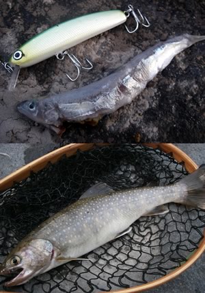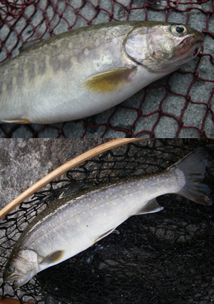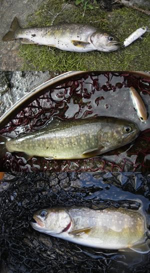 “郡上のアマゴが釣りたい!”急に芽生えた釣欲の高まりを抑えられず、いや抑える事など無く、異様に盛り上がった僕達二人は、午前1時を回った頃、岐阜県は郡上八幡へと・・・向かうものの、いきなり京都東インター封鎖!!釣りの事しか考えてないの頭の悪さがこんなところに現れます。いきなりの事に訳も分からず、Uターンをかまして再度インター突入を試みるも入れてくれるはずもなく・・・大津インターへと、これが迷走の始まりだったとはこの時に気づくはずもない。午前四時過ぎ期待でいっぱいの郡上八幡へ到着。綿密なるポジティブ計画では朝の内に本流域でポンポンポンポン〜て感じで、引きの強い郡上アマゴを満喫し、日が高くなってからは支流に入ってイワナを堪能、日が傾き始めたら再び本流でサの付くマスを狙ってみたりして・・・期待の立ちこめる夜明けの長良川で川沿いを走りながら1ヶ所目となるポイントを見つける。強い流れに力強く泳ぐアマゴちゃんを想像。良い流れにポ〜ンと投げ込みトゥイッチ・・・そう甘くはない。上へ行って良い大きな瀬を発見。コンコンコ〜ンと誘いを掛けるがルアーを追う魚影無し、全く無しです!?上手くもないがド素人でもない僕達はこの川の危険度を感じ取ったのです。“なんか、やばいな、これは”苦笑混じりに二人揃ってそう思った訳です、もう本流は諦めました。次ぎに目指したのは支流の吉田川。かつてZONくんはこの川とこの支流でイワナとアマゴをもの凄く釣った経験があります。しかも使用したルアーはサミング70。まだアイテムも少ない時代だったのに何十匹も・・・釣れるはずです。仮にその時は好条件だったにしても、今はアイテムも増えてるし・・・。で、ここからです。さぁ始まりましたよ、迷走の旅が・・・あまりに長い時間でレポートには書ききれないくらい、支流を何本も何カ所も・・・午後1時までの間に魚との接触はZONくんがイワナ一匹と二人のルアーにチェイス&ヒット数回。この頃には敗戦ムード一色に染まっておりました。そう自分たちの未熟さにわらけるほどです。しかしそんなわれわれを天は見放さなかった!お告げが御座いました、こんな具合に“sadda氏に電話しなさい〜”“はい、すぐに電話しま〜す!”とお仕事中にもかかわらず助けを求めると、さすがは郡上の神様、いやいやsaddaさん、もう既に情報を御用意下さいました。しかしながら、この地の大きく丸い滑る石に体力を奪われた僕達はかなりの疲労状態。目指すは白鳥町、この地を最後と考え、何とかポイントを見つけては竿を振り続ける。何処を見ても釣れそうな流れなのに釣れない。ほとんど惰性にアクションを付けていると、突如お魚の反応!見事にフッキングし、逃すまいとズリ上げです。しかし体色があまりに黄色く、釣り上げた時は“ここまできてカワムツかいな〜”と思ったりしましたが、単なる疲れ目でした。ようやくイワナゲット。日も陰ってきて何となく僕達の活性も上がり始め、さらに上流へと突き進む事に。もう時間も4時を周りもうこの地が最後になろうかとというポイントに到着。二手に分かれて釣り始め僕が小さいが太いイワナゲット、他にもアタリあり。ZONくんも1匹追加でようやく釣りに来たって感じです。最後の最後は気配のあるトロ瀬を二人して狙う事に。根掛かりの無さそうなポイントなのでZONくんに“最後はF55やろ〜”と言ってみる。しばらくして隣を見るとファイトしてるし!しかも取り込みも慎重、27センチのブッといイワナゲット!ルアーはF55。対岸に投げて巻いたらいきなりグッって止まって“最悪!根掛かった〜”と思ったらこの魚だったらしい。ネットに入れて眺めていると、ペッと吐き出したのは溶け始めたアユ。最後の最後に素晴らしいイワナ“郡上に来た甲斐があった”とZONくん。何だか僕もホッとして気持ち良くキャストをし始める。するとアップ目に落ち込みを狙ったS45・アバロンワカサギにググンッ!と明確なアタリ。すかさずフッキングをあびせてキャッチしたのは同サイズのイワナ! どうも表情を見ているとさっきのに比べてオスっぽい。それにしても最後の最後の最後に僕にも釣れた良型イワナ。来て良かったと言うよりは、何とかまともな釣行にしてくれたsadda氏に感謝です。sadda氏によると、先日からアユシーズンに向けて放流が始まっているらしく、その魚を狙ったアユパターン的な動きがイワナ達にも出ているそうだ。エエ勉強になりました。帰った時はヘトヘトになって、もうしばらく遠征はエエかなと思っていたけど、もう回復したのでいつでも出動可能だ。 |