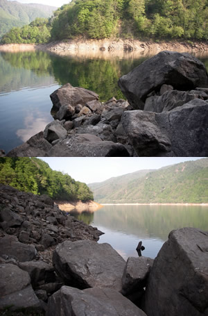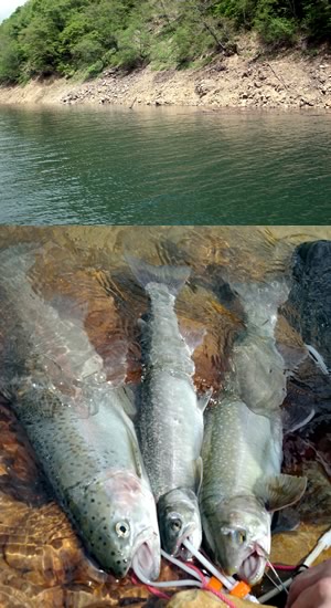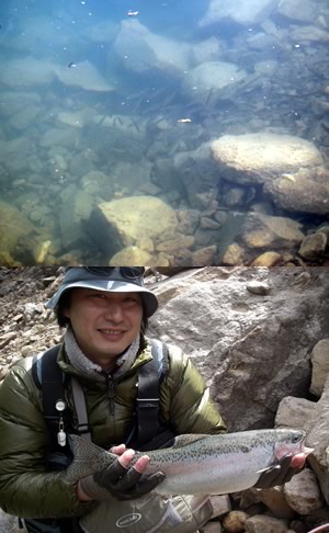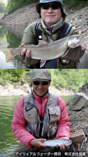 | 林道ゲートのオープンを待つ車の数は自分達の前に10数台、後には20台、いやもっとか・・・富山県の山中、標高1000メートルを超えるこのダムの解禁を待つ猛者達がここまでとは。今回遠征を試みたこのダムの名前は有峰湖。関西の釣人にはほとんど馴染みのない人造湖で、完成したのは昭和35年との事。(詳しい内容は“ありみネット”で検索してくださいませ)そして本日この湖で狙う獲物はと申しますれば、それはモンスターイワナでございます。ネットでも特に情報の無いこの湖の魚をなぜ釣りに行こうと思ったのか?それは当然お導きがあっての事です。その人物はレポートコーナーでもお馴染みのsadda氏。この計画が進んだ経緯については話が長くなるので止めときますが、どうやら“この解禁こそまたとないチャンス”である事がsadda氏からビンビン伝わってきたのは間違いありません。だいたい“モンスター”などと聞いてこっちも興奮しないわけはない。僕が京都を出発したのは前夜の午後8時半前、美濃インターには午後10時半に到着し車を一台に。地図で調べたところ、ここから2時間は掛かる。暗闇の道中ではあるが横に流れる河川の説明を受けつつ今後の?更なる野望を膨らませる。2つか3つ峠を越えて最後の最後は何年ぶりかの車酔い。ようやくゲートに到着したのは午前1時頃の開門5時間前、にもかかわらず15台も前にいるとは・・・え、何?山菜採り?!驚いた、並んでる半分くらいは山菜採りなのか〜、ちょっとしたカルチャーショック。取りあえずは逸る心を抑えて仮眠し5時頃起床。周りの熱気からして取りあえずタックルの準備しておいた方が良さそう。気温は7℃くらいか防寒用にダウンも持ってきていて良かった。そして待ちに待った6時開門。“いや〜どんなところか楽しみだ〜山もさぞ綺麗だろう、写 真撮っておこう〜”なんて思っていたらsadda氏の目は既に鋭さを増している“ここからはラリーです”・・・何のこと?料金所で道路料金を払うやいなやトップスピードに突入(ちょっと大げさ?)。一気に前の車に追いついたと思ったら、その車はやたらとチンタラ走ってる?これは彼らの作戦でした。前方に走る仲間の車に余裕をもたせる為の・・・なんと凄まじい、彼らの戦いはもう既に始まっていたのだった・・・結局sadda氏が狙っていたポイントではルアーマンとの競争は無かったものの、意外なライバルは餌師(まき餌とかして長竿で釣る)。何年も通 っていると思われるこのおっちゃんは車を降りてからの準備が早いのなんのって、あまりの焦り様にこれから藪漕ぎなのに僕の格好はピンクのダウンにフィッシングベストやで・・・っていうか、はよ釣りの話ししろってか、はいはい。途中までは舗装されているが、初めて来たら絶対降りない様な獣道を降りて、周りを見渡せば典型的なガレ場に囲まれたダムである。 水の色は適当に色付いてドクリアーでないのが救い。しかしこの時間帯はいただけない。7時ともなればもう陽は高く、普通 ならかなりのプレッシャー。ダムでの釣りもあまり経験がないだけにピッタリとはまるイメージが湧かない。しかしさすがはこの地での経験を積んだsadda氏は違う。10分もしない内にヒット!44センチの立派なイワナ。ルアーはサム山岡ハンドメイドLDF-65 アバロンチップヤマメと渋い〜。まだ納得できるサイズではなく、ヒットしたパターンは駆け上がりに付いている魚をかなりスローに小さなアクションで誘って食わせたらしい。どうやら岸際には5センチくらいのワカサギが小さな群を作って回遊していて、たまにボイルも見掛ける。ポイントを先行させてもらって岸に平行気味に狙って行くとワンチェイス。そして慣れない僕には移動が困難なガレ場を徐々に進み丹念に狙っていく、地形に少し変化のある場所は要注意。いろいろなアイテムを試したけれど、しっくりくるのは確かにバルサモデル。LDF-80をsadda氏ほどではないにしてもかなりスローに水深を保ちながらゆっくりアクション。水中に変化の見えるここぞというポイント、そしてステイ中に明確なアタリが!やりました〜初ヒット!フッキングはしっかりしてるので落ち着いてランディングしたのは35センチのイワナ。サイズはまだまだ小さいもののかなり嬉しい一匹。その後は同じように狙うもアタリ無し。魚がウブな解禁日とは言え、かなり陽も高くなり難しくなってきている。もう駄 目かな〜と思いながらふと後ろを見るとsadda氏のロッドがしなってる!さっすが〜!どうやらレインボーらしい。長い格闘の末にキャッチしたのは見事な体格の48センチ。ルアーはチャンク アバロンチップ。何と!その手があったか〜。この辺が経験の違いである。チャンクの飛距離を武器に対岸を狙い、かけ上がりから離れたところでヒットしたそうだ。という事でその経験値頂きます。昼近くになり午後が難しくなる事と他の河川も案内してもらいたいので、今回はこれにて秘境有峰湖を後にすることに。それにして