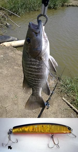 | 広東省中山市にバラマンディーやマングローブジャックが釣れる養殖池があると当地在住の友人から聞かされ、広州市への出張を利用して出かけてきました。連れて行かれた場所は広州市から車で1時間ほどところにある養殖池で、深センや香港に駐在している日本人もよく訪れている。全部で4つある池のうち、ルアー用に開放されているは100m×50mと100m×30mくらいの二つの池で、この中に、バラマンディー、マングローブジャック、キビレアジ、レッドドラム、雷魚、ナマズなど多様な魚が放流されており、全部15種ほどいるのではないかという話でした。当地での釣りは実は2回目、前回の釣行時は勝手もわからないままに釣りをしていましたが、今回は手に入れたサミング90CW(ホロクロキン)を携えての釣行となった。水色はどちらかと言うとにごり気味で「これならクロキンが効くだろう」と思い、早速サミング90CWを投入。開始して10分、ガツーンというひったくるような強烈な当たり。バスなんかとは比べ物にならない強烈な引きに5分ほど耐えて、上がってきたのはマングローブジャック。 メジャーがなかったので正確には分からないが40-50cmくらいで、体色は銅のような色をしており歯が鋭い。ルアーを見てみると傷だらけであった。この後、日中の強い日差しであたりも遠のいたが、夕方頃チャンスが再び訪れた。水の動きのあるポイントになげこみ、ショートジャークを入れるとすぐさまあたり。ドラグから糸が引きずり出され、右に左にと大きく動く。その後ピクリとも動かなくなり、「なにか巻かれたかな?」とラインテンションを緩めると再びドラグから糸が出される。10分ほどのやり取りの末、やっと上がってきたのは朝に釣ったやつと同サイズのマングローブジャック。針をみるとているフックがのばされ掛っていた。養殖とはいえやはりパワーがすごいなと実感した。 結局この日は、上記以外にもバラマンディー(40cm前後)、キビレアジ(25cm)などを釣りあげ、非常に満足した一日となった。次回はサミング70やサムバイブなども試してみようと思っています。今度はバラマンディーの大物を釣ってまたレポートします。 | |||