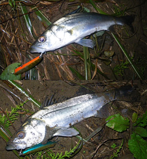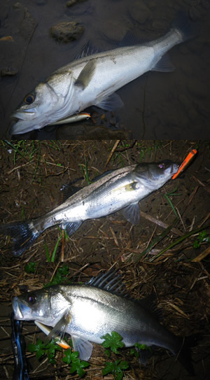 | 白濁りの水にふらふらと流される黒くなった鮎と何処からともなく聞こえる捕食音。あのたまらないのイメージをまた確かめるべく日本海側河川へ。。。毎年台風で川の 水深等様相が変わるので、今年も明るいうちから駆け上がり、瀬、流れのヨレ等観察 から始めます。特に今年は大水があったので川の様子の変わりようは相当な物です。それになんだか皆様トップトップとえらい騒ぎよう。確かにトップで喰わせる事はあっ ても、まだペンシルベイトで喰わせた事はなく、そのイメージも興奮に拍車をかけます。しかしペンシルビギナーズである事は変わりなく、流れの太い激流で操っても、泳がす向きやラインの存在が気になり今イチ確信が持てず、下流に足が向いてしまいます。散々打って最後、流れが対岸に当たり、大水の障害物がヨレを作り駆け上がり続くポイント、今日はトップメインと決めてはおりましたが弱気になりリップのあるものも散々投げたと思います。そして、あきらめずに結んだフラッシュバック、アッ プに投げてヨレの中、顔をちょこちょこ出すイメージで流していると、ジュボ!と聞き 慣れた音とともに首振り。ホンマに釣れた55cm。ファットサムではありませんでしたがトップに出さす為に操ったルアーに食いつかす事が出来た、しかも明るいうちです。まあ気持ち悪いくらいニヤけていたでしょう。そのまま日が落ちて一旦納竿。ご飯を 食べて7時半頃川に戻り、フラッシュバックポイントに入りましたが潮が満ち出して何か雰囲気が変わっています。駆け上がりとヨレが良い定着場所に先程はなっていたのですが、水深が変わり通 過点になってしまってる様です。もう一つ目星をつけいたて た大きな開きに向かうと浅く激流だった明るいうちとは打って変わって、良いヨレを 作る流れ込みのようなポイントになっております。少し下流から入ったのですがミデ アムでUを書いた時にいきなりアタリを取り、しかも少し上流ではバフ!バフ!と捕食音。興奮はマックスです。捕食音があった対岸近くの駆け上がりにミデアムを遠投し数秒流すとバフ!と40代の美味しそう系が釣れ、次は操作して喰わそうとフラッシュバック を結び、遠くにある暗がりの中水面をピョコピョコ漂わすイメージを数等繰り返すと またしてもバシュ!っと同サイズ同系。写真を撮って、お土産をキープして再開しようと竿を握ると。。。ビックリしました。横に釣り人。そんな場所と言えばそんな場所なんですが、夜にそんな場所で人に合うと相当ビックリします。それに遠くの対岸に もLEDライト。確かに上げ止まりの時間です。しかし10年も前の事を考えると春の昼間にサツキの釣り師に出会う事はあっても、そんな薮ばっかりの場所で夜に出会う物と言えばタヌキかシカかそんなもので、それを思うとこんなへんぴな釣り場が混むなんて、ここ数年での変わり様は相当なものです。しっかし10年前から全く変わらないのはサムルアーズの釣れっぷりでございます!。敬礼!。その後、型は落ちましたがミデアムで2匹追加。そしてファットサムJrの板錘で少し重くした仕様で、抜き上げの時に無理をしてピョーンと外れましたが初のペンシルフィッシュ。周りの釣り人はイソイソと上流へ下流へ移動されていたので、、そのエリアは制圧したかと思われます!隊長どの!。そして魚のお腹の中を調べてみると大きな鮎が何匹も出てきました。 落ち鮎シーズン(プレか?)は、もう始まってる感じがします。そして!なにより鍋が始まる!ポン酢だ!酒だ!ビールだ!。又行かなくては。 | |||