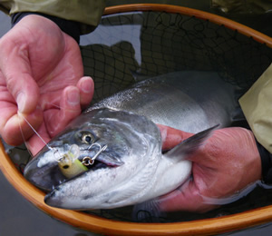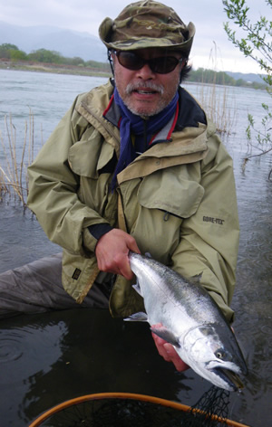 | kanemaです。今年の九頭竜サクラは私にとって20年目の節目の年です。そしてモテ期かもしれません。「何がっ?」って・・・魚ですけどね!今月の12日、社員A氏のサクラマスを拝み、19日には僕自身初となるランカーバス(63センチ)を釣り上げ、内心何か有るなと思っていました。そして4月26日その予感は大的中しました。今年5回目(内4回は社員A氏と一緒)の九頭竜川サクラマス釣行、本来なら25日の予定でしたが、24日の雨の影響で26日にシフトしました。午前6時頃、社員A氏は先日サクラマスを釣り上げた福井大橋上流左岸へ、私は水源地前へ入ることに。前日に149センチ有った水位も入川した頃には78センチと落ち着きましたが季節柄代掻きの影響で水色は白濁していました。その影響でしょうか人出はこの時期としては少なく思いました。私の入ったポイントは一昨年バラシタ所(いろいろ有って去年は九頭竜川へは行きませんでした!)で今年も釣行毎に狙っていました。対岸の中洲にはフライマンとルアーマンが一人づついて、6時40分頃ルアーマンがサクラマスをヒットさせました。この日の朝は活性が高かったのか、周りでサクラマスやウグイ(ニゴイ)などのライズが見られました。私の目の前でもライズが有りこれはチャンスと「サミング90CW」をキャストしますが反応が有りません。暫くして社員A氏から何かの魚をバラシタと連絡が入り私もこちらの状況を報告、もう少し粘ろうと話をして電話を切りました。今度は「サミングアバロンチップ70SSワカサギYB」をセットします。一昨年のバラシタ時もこのルアーだったのでこれと信じてキャストし続けました。ダウンクロスにキャストしてリールのベイルを開けたままラインを送り込み、ヨレに入った時にラインを止めリールのハンドルを巻かずにロッドをスウィングさせながら「サミング」をナチュラルにドリフトさせます。暫くこの釣方で攻めているとヨレから出た瞬間にアタリが有りました。グングンとサクラマス特有のアタリです。すかさずアワセを入れましたがラインが出過ぎていたのかフッキングには至りませんでした。杭になり10時頃まで攻めるも釣果無く、それでも社員A氏はトータル3回のアタリ(2回目のアタリはサクラマス特有の首振りが有ったそうです!)が有り、二匹のウグイを釣り上げたそうです。その後ポイントを移動し昼食を挿み二箇所ほど上流部を攻め午後2時30分時頃朝一に入ったポイントに戻りました。暫くは福井大橋上流左岸を攻めましたが、水源地前のポイントが気になったので午後3時15分頃そのポイントへ移動しました。その場所は瀬のひらきで足元にはテトラが入っていて右下流に向かって浅くなりガンガン瀬になって行ます。先行者が居たので50メートルほど上流に入り、先日社員A氏のヒットルアーでも有る「サムバイブ15G」で攻めます。この頃には朝の様なライズや小魚等のモジリは無くなっていました。暫く攻めていると先行者が居なくなったので少しずつ下流に下がりながら攻め直します。クロスにキャストしては沖合い下流の流れのヨレや足元に入ったテトラの下流側を攻めますが中々反応が有りません。丁寧に攻め過ぎたのか手前のテトラに「15G」を引っ掛けてロストしてしまいました。新たにリーダーを組み直し「サミングアバロンチップ70SSワカサギYB」をセットして攻め続けます。数投後下流側のテトラ沿いをソフトにトゥイッチしながらリトリーブしてくるとサミングでは絶対にボトムノックしない所で「カツカツッ!」と感触が有りました。試しにハーフキャストでそのラインをトレースして来ると今度はその場所よりも下流で同じような感触がありました。もしそれがサクラマスであったならば警戒するに違いありません。私も高くなった心拍数を静める為にタックルチェックをして時間を稼ぎます。落ち着いた所でダウンクロスにキャスト、ナチュラルにドリフト、そしてラインが下流イッパイになった所からソフトトゥイッチ回収リトリーブ。立ち位置から10メートルほど下流のテトラ際に「サミング」が通りかかった時「カツッ!」と言う感触と同時に「ゴン!」とアタリが有りました。ロッドが弧を描きジリジリとラインが出て行き、「グングン!」とサクラマス特有の動きを見せます。しかし本物かどうか確認できるまでは安心できません。強めのロッドなので伸される心配は有りませんがこの獲物は中々姿を現しません。それどころか足元まで来て手前のテトラの深くなったところへ潜ってしまいます。1分ほど経ったでしょうか、ようやく浮いてきた獲物は数年ぶりの彼女(サクラマス)でした。それからが大変でした。彼女を下流からランディングしようとすれば尾びれで叩いて飛び出るは、浅瀬へ誘導すれば上下流に走り回り、しまいにはテトラ同士を繋いである太い鎖にラインを巻きつけるは、それを後ろからランディングしようとすると脱出して私の股をすり抜けるは、私はと言うとそれをかわすのにロッドを空に