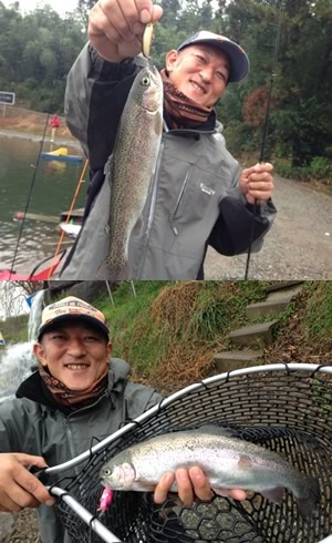 | お世話になります、群馬の小林です!ストライパーの聖地、日本一アグレッシブなエリア!群馬の名所!我らのMAVがトラウトエリアにリニューアルオープンとなりました。僕自身の例年はもっとのんびりスタートなんですが、今年は「サムルアーズのみで何処までトラウト達と戦えるか?」をテーマにオープン初日から挑んで来ました!個人的な予定では「初日だからまだ魚もスレて無いので、オリジナルサイズのプラグだけでイケるでしょ!サミングにチャンクにコトカスまでウヒヒ」でしたので、しばらくはオリジナルサイズで投げ続けました。見える所まで追ってくる魚は居ますが、まだルアーの食べ方をスタッフに教わっていない為か?(んなわけない)食いついてはきません… ならば!と保険に持ってきたサミング40cwに付け替えてみると、物凄い猛チェイス!凄い勢いでチェイスしてきます!が、しかし、いかんせん乗りません…「本能的に反応はしてるけどやはりスタッフからの指導不足なのか?」と思いながら(んなわけない)20バイトほどでようやくキャッチ!その後も苦戦しながら数本のレインボーが釣れましたので、今度はチャンク35cwに付け替えると1投目から反応有り!「あらやだ、好反応。」と同じコースを巻いて来るとドン!明らかに大きな当たり!GOODサイズのドナルドソンが上がりました!その後もサミング40cwとチャンク35cwで数本キャッチ、終わってみれば釣れた数は決して多くはありませんが、少ない手持ちのルアーで果 敢なトラウト達のチェイスを見られたので結構楽しめました。今後の課題はタックルバランスですかね?エリアトラウトに16ポンドでは無理が有った気もします…。トラウトシーズンも手持ちアイテムが少数精鋭ですがサムルアーズで頑張ります!ありがとうございました。 | |||