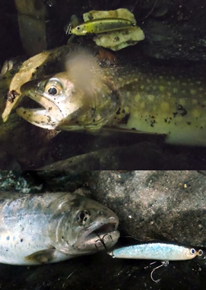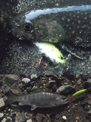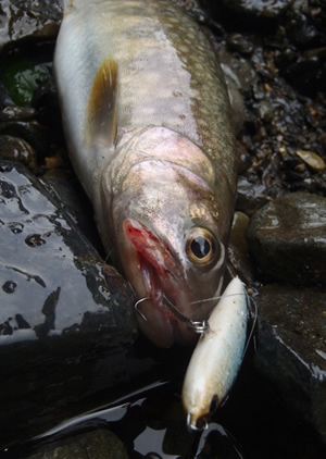 | 朝、04:00に合わせた目覚ましは意味を成さず。気がつけば07:00起床。いつも通 りの朝になった訳ですが、いつもとは違う事が一つ。そう、昨日の夜に渓流ルアーのフックを全て付け替えたってこと。そして、社員Aにおもむろに託された、いや奪い取ったアイテムもあるってこと。さて、冷静なフリをしてコーヒーを飲み歯を磨く。そしてまるで仕事に出掛けるかのごとく「今日は遅くなるよ」と言い残し、アクセル全開で一路日本海側へ!道中、社員Aの呪いのメッセージが頭を駆け巡る。いやいや久しぶりの釣りだから行けるだけでも幸せだと思うとアクセルを踏むチカラも弱くなるってことで。到着したら既に昼前位 、川沿いの道をチェックしながら上流へ。どうやらかなり雨が降ったのかミルキーな川面 を眺めることに。ZON師匠とよく行った場所も、ん〜、ちょいと水量が多すぎる。ならば知りうる限りの最上流へ大移動。勿論、先行者も無く濁りも程よい。以前のチェックではド渇水で諦めた場所ですが、昨日おっちゃんが「水の変化があればおるとこにはおる」と言ってた暗示が炸裂。社員Aから託されたSJ45をぶら下げ、小さなお椀状の白波へGOです。竿先を大きく煽り、小さくチョイチョイ同じ動きをもう一度!ってガッツリです。1投目の出来事、27cm良い型のイワナ。その後もジグミノーを淵へ滝壺へ容赦なく放り込んでみます。そして分かった事。勿論、S45を先に投げたりもした訳です・・・・しかし、、、これまでもこの河川ではS45は幾度となく投入してます。しかし明らかに反応があった時はSJ45に対してのチェイスの影がデカいんですわ。デカいかどうかの確証は釣れてないから分かりませんがね。釣るに至らずともほんとひしひしと感じましたよ。その後、瀬はS45 深い淵はSJ45でつり上がり、釣り下りです。S45の安定感はもちろん相変わらずです。安定の釣果 です。移動を繰り返し下流域にて、面倒くさがりのオイラは瀬の中にSJ45を無理矢理に投入、反応無くターンして回収と思った矢先に、すぐ下の溜まりから銀色の閃光がドーン!です。デップリ太ったヤマメですよ。沈めて良し、浮かせて良し、漂わせて良しとはすごいねジグミノー・・・・・内心、 引っかかったら泳ぐ覚悟で釣りしました。今日一日。おっちゃんは「渇水時になー」なんて言ってましたが、増水時にも使いようですね。S45とSJ45は釣りが上手に なった気にさせてくれる。とっても良いミノーやなと感心しながら車を走らせてると鹿と当たりかけました。あっそっか、当たりの日だったのかもね。 | |||