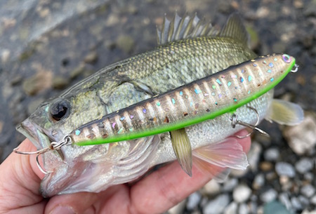 オリジナルのダイヴィングサム90では難しかったウォークアクションが綺麗に決まるし、ダイブは難しいのかと思いきやイイ感じに出来る。加えて視認性が高いのもオリジナルと違うところ。なかなかに良いとこづくしのペンシルベイトです。