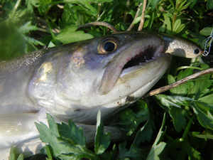 (S45の横っ腹にかぶりつく長良川の泣き尺岩魚)