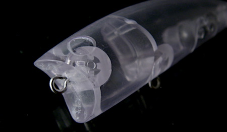 また、この水受け形状(クォーターパイプ)が可能にするアクションは他にも有り、サム山岡ハンドメイドモデルと同じリトリーブによる水面下でのウォブルアクションです。この動きはカップ形状のポッパーでは難しいでしょう。先行して使ってもらっているユーザーの方々からは、今のところ巻いて釣った報告は入っていませんが、過去にはハンドメイドモデルの巻きでシーバスがヒットした報告がありました。自分自身で流水域で実際に動きを試した印象としては、かなり使える動き(ダウンクロスでドリフト&表層アクション)である事を確認しました。河川のバスやシーバス狙いにも有効と考えます。またソルトでは表層アピールで誘い、巻いて食わせるってもの十分イメージ出来ております。その内に面白い結果が出てくるのではないでしょうか。