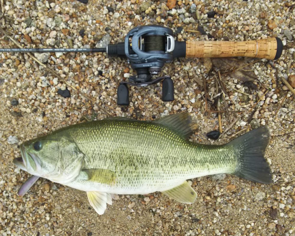 到着後様子を見ていると、やはりボイルが起こります。まずはフラッシュバックを投げていくもなにも起こらず、もっとゆっくり誘おうかと思い、ファットサムJr.で誘うもなにも起こらず。ボイルする魚と目があったような気がするほど魚は積極的に補食しているのですが、、、スラローマーも試したんですが、、、。ここまでの流れは実は2日続けてだったので、場所を少しだけ変えてみました。湖流なのか、何なのか水面が違う模様の所に流されてきた竹の葉などが浮いています、少し様子を見ているとボイルが起こりました、魚が居るとわかったので、表層系ルアーを投げ、何も起こらず、スラローマーにシフトし、何も起こらず、やけくそぎみに、ちょっとスラローマー本来の動きが崩れるスピードで巻き、大きめにトゥイッチにしてみると重みがのりました!ここまで重いのは初めてだったので慎重に、2回ジャンプされましたが無事浜にあげれました。あがってきたバスの口にはルアーはなく、下顎の外側にフックが刺さってて、なんだかこれで良かったんだろうかと。。僕の中では一番大きいバスだったので嬉しい反面、喰わせれなかったんかな?と。 しかし、サムスティクも良くしなり楽しめました。ありがとうございました!