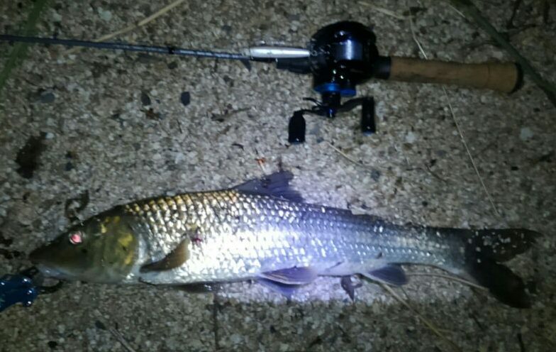 暗い夜でした。今夜も52ULで釣行です。一カ所目にサミング70Fを投げるも反応なし。サミング70HiFの1投目にゴンッとバイトでぶち曲がり!54センチのニゴイでした。二カ所目はコトカスミディアム、サムバイブ75F、コトカス、サミング70Fに反応なし。サミング70HiFを投げるとゴンッ!何度かエラ洗いしますが、ぶち曲がりの52ULが伸されながら耐えてくれます。49.5センチのバスでした。三カ所目はコトカスミディアム、サムバイブ75F、スラローマー投げますがサムバイブ75Fにワンバイトの。サミング70Fを投げるとゴンッ!なかなかのファイトで楽しましてくれたのは、44センチのバスでした。その後、何カ所か確認しながら最後の場所でチャンクSSRにゴンッとバイトし、52ULがバットからぶち曲がり伸され、フッと軽くなりました。リアフック2本伸ばされてました。せめて正体を見たかったです。狙い通りのヒットあり、フック伸ばされありと、また行きたくなる楽しい釣行でした。