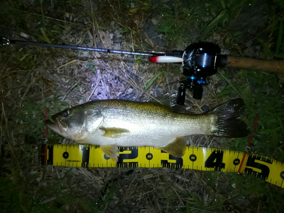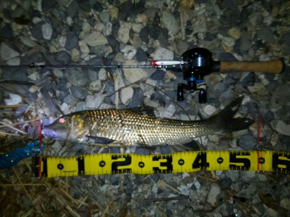風がなく厳しい夜でした。今夜も52UL一本勝負です。気になるポイントを回りますがコトカスミディアム、コトカス、サミング70F,SP,HiF、リップレスサミング70SPなどに反応なし。直感で沖にサミング70Fを投げ、無防備にフラフラ泳いでるイメージで巻いてくると、かすかな違和感が。数秒ぐらいの間、違和感を確認してるとバイトでした。とりあえずフッキングするとヒットし46センチのバスでした。その後は反応なく諦めながらサミング70Fを巻いているとガツンとバイトで52センチのニゴイでした。他の場所でハスらしいバイトがサミング70Fに何度かありましたが、全てバレました。今夜はサミング70Fに助けられました。