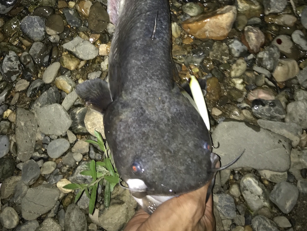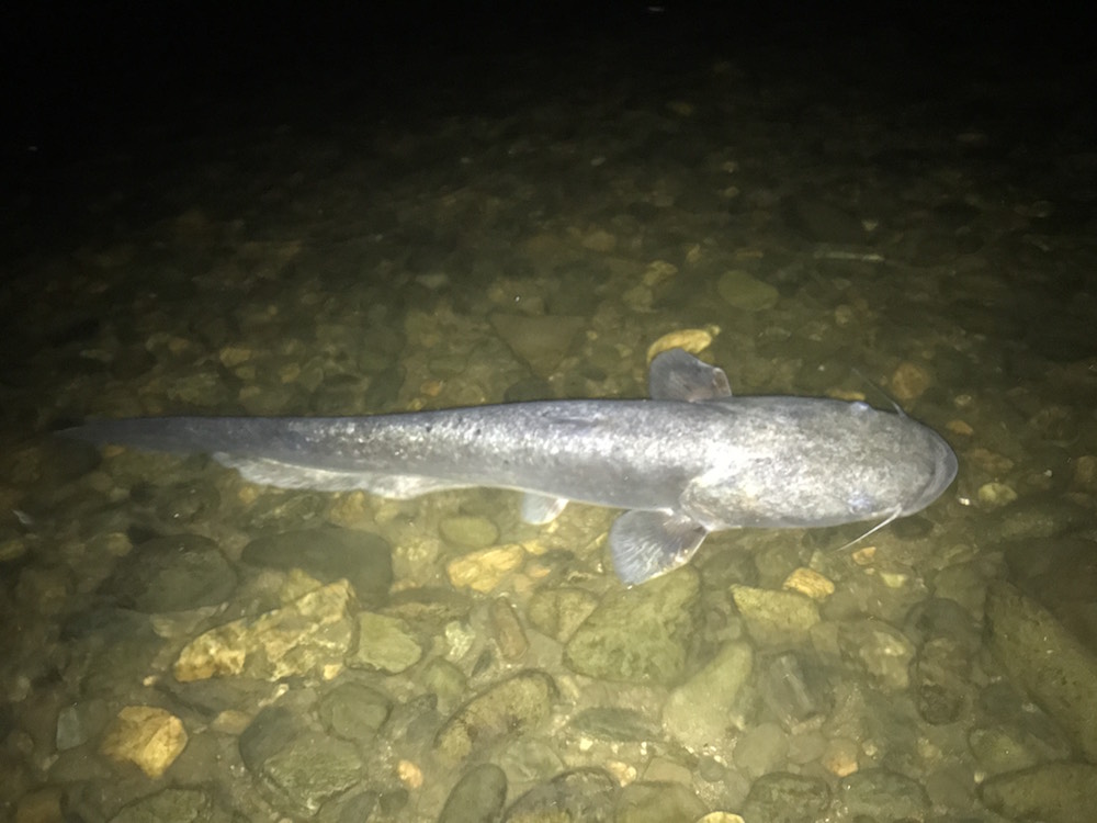 仕事終わりに職場近くの川に出かけてきました。減水ぎみの瀬に立った頃には薄明るい時間でした。かなり浅い場所ですが、所々で小魚が波紋を作っていてバイトの予感を漂わせていました。期待を膨らませてルアーやキャスト方向を変えて投げ続けていたところ、割と静かめのバイト。一気に竿が絞られ、慌ててドラグを調整しました。すでに真っ暗でしたが何度かの突っ込みの先々では小魚の群れが逃げまどい、かなりの小魚がいた事と、一度に走る距離に驚きました。慎重にやり取りし、やっとの思いでずり上げると小さめですが初魚のビワコオオナマズ。紫雲のごとき模様、あさりの強い歯、古代魚のような風格。こんな魚種の若魚に会えて嬉しい限りです。