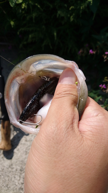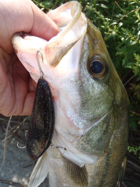 ご無沙汰しております。9月に入り少し涼しくなったので久しぶりに釣りに行ってきました。2年前に小さいながら何匹かバスを釣った川です。相変わらず茶色な濁り水に、この日は浮きゴミも沢山。ファットサム、FP2を投げましたが、すぐに水面ははあきらめて巻いてみることに。浅場~水深のある所に狙いを変えSUMVIB SSでゆっくり沈めてからのただ巻きでした。(沈み物に喰われないように針2本はダブルフック)数投目、わりと手前でガツン…丸飲みでした。SSモデルは泳層のコントロールがしやすいので助かります!