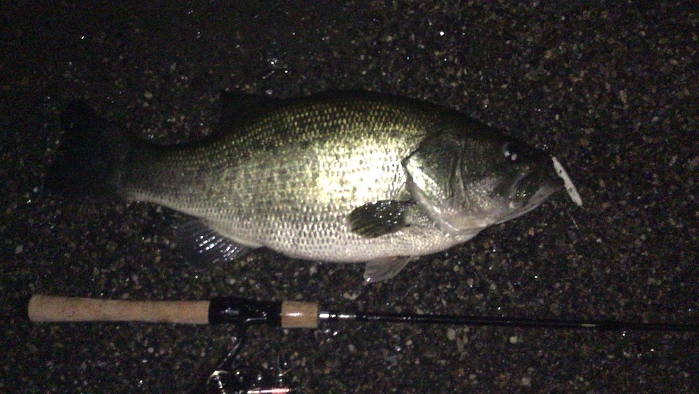 はじめましてtomosといいます。去年から15年ぶりにバス釣り再開しました。釣り歴トータル約5年になります。この日は暴風で風が心配でしたが、釣り場に着くと穏やかな天候でホッとしました。さっそくフラッシュバックシリーズで釣り歩いていきます。バイトは結構あるけどなかなかフックアップ出来ず、小さな小さなハスとバスが数匹釣れました。途中30cm位のバスが2匹同時にトビウオのようにバイトしてきましたが、ルアーを飛び越えていっちゃうので当然フックアップせず。暗くなったのでスピニング(ニュータックル)にチェンジ。使いこなしたいなと思ってるLipless suming-70SPで来た所を帰って行きます。流れ込みで少し距離を取り流れの向こう側、岸から約5mの所にキャストしてゆっくりただ巻きしてくるとゴンとバイト。すぐに大きな魚だと分かりましたがバスのゴンゴンしたひきでなくギュイーンと走る走る。ドラグの調整おかしい?けどロッドはこんなに曲がるもの?ってぐらい曲がってます。ニゴイ、ナマズの大きいのは何匹か釣ってる所なので、どっちかのスレかな?と思いつつ巻いて走られを何度も繰り返し、やっと上がってきたのは、大きなバスでした。Lipless suming-70SP大好きルアーになりました。ありがとうございました。
