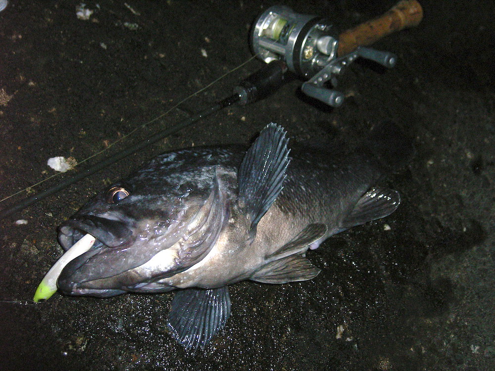 遠征中、夕飯を食べた後に気になっていた事をフト思い出したので、ソイ釣りをしてみました。この手の魚種の場合、ある程度居場所が偏っていたり、テトラの穴状になった箇所を狙うと思うのですが、この時も最初は居場所を探して移動しながら探って行きました。この辺やと思うけど・・・という箇所の、穴ではなく外に面したテトラの隙間のややこしい場所に放置していると徐々に近寄って来たのか、しばらくすると抵抗を感じたのでグリグリ引き寄せると35cm。後が続かず、気になっていた案件を検証する事に。遠投してから少しずつ手前側に距離を刻んでいると、ある距離で着水後に「コ?」。感触からしてガヤ(エゾメバル)ではなさそうだし、これはやはり・・・。引いてレンジキープしても反応が無く、潮流が一定の方向に押している箇所を使い、サミングして充分にボディを揺らしてから流れに合わせて表層でラインを緩めずに少し送り込むと、ズコーンと引っ張り込まれ、40cmちょいの良型です。急に雨雲がやって来てテトラが濡れたので(こちらのテトラは濡れるとズルズル滑って危ないです)やり過ごす間にテトラの隙間に縮こまってしゃがみながら先程の要領で今度は沖目に広範囲にキャストすると、ほぼ1投1匹で25~30cmが釣れ続きます(マゾイも1匹混ざりました)。この日の昼間は結構難しい他の釣りをしていた事もあり、魚ってこんなに釣れてもええの?と疑問が湧く程に。雨も止み帰る前に大物狙いを仕掛けるとズシンという衝撃で竿がのされ、強気で寄せて抜き上げると、これは立派なサイズ(40UP)。船でなくてもこんなの釣れるのか~。しかし写真を撮ろうと構えると急に暴れてお帰りに・・・。トータル10数匹釣った後、最後は35cmが釣れて終了しました。大きいのを2匹だけ持ち帰りましたが、よく釣れるサイズに比べて食感や味も良く、刺身にしたら食べ過ぎて翌日に響きました。