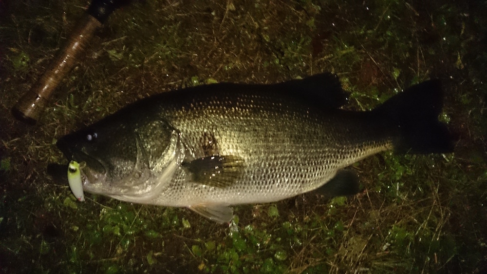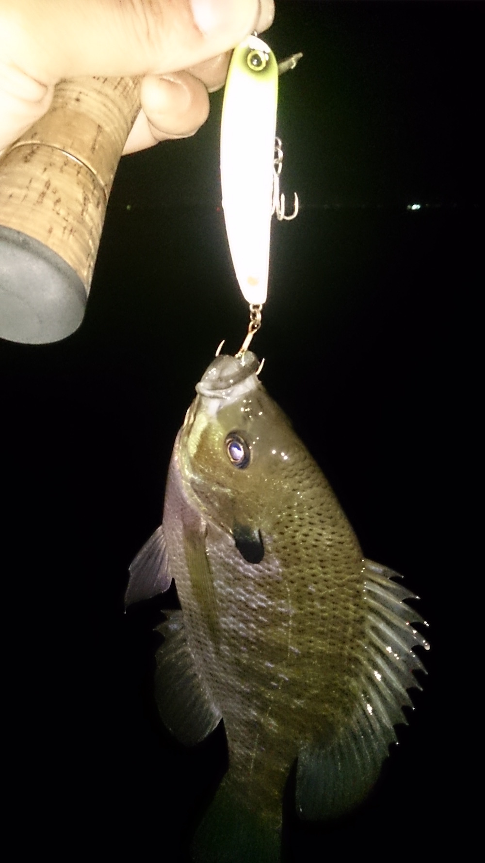 失礼致します。最近では友人と“バス釣り”といわず、“ルアー投げ”といっています。雨の止み間に少しだけ、と久しぶりのナイト釣行。何ヵ所か廻るも雰囲気なし。最後にギルにでも遊んでくれないかとウィードが濃く残るエリアへ。コトカスの着水ほっとけ&チョンで念願のギルゲット。その後もアタリはあるもののフックアップには至らず。重みが乗るまでは合わせまい、とじっと我慢します。と、漂わせていた方向で明らかにギルではない吸い込み音。竿に訊いてみますと微かな魚信が。たいして重みは乗ってませんのに、我慢しきれず合わせてしまいました。残念、もうちょいシャクレさんやったらなー。何が正解か解りませんが、また “ルアー投げ”に行かなあかんなと改めて思いました。