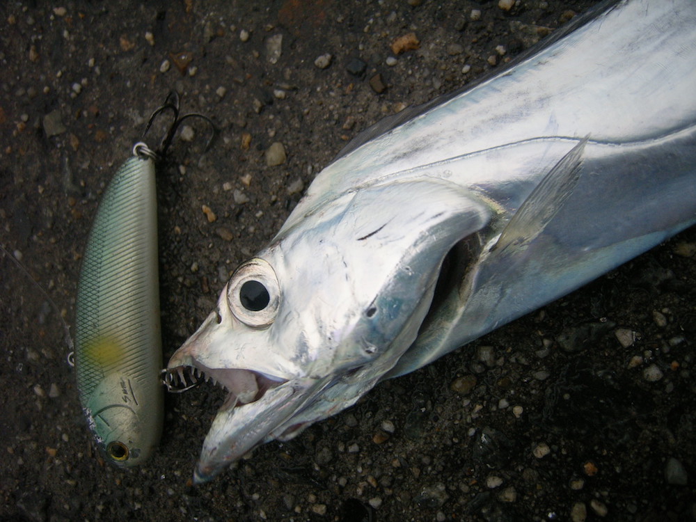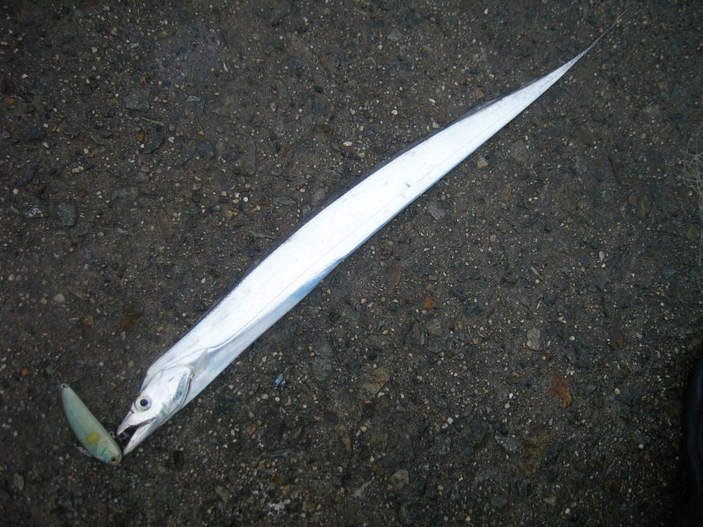 例年もう少し先の時期に大型のタチウオを狙いに行くのですが、早い時期(と言っても皆さん9月頭から釣っておられるので遅いぐらい?)にあまり行った事が無かったのと、深夜の難しい時間帯を攻略すべく夜に出発。途中に所用を済ませようと寄り道をすると長引いてしまい、釣りスタート前にコケました。やっと到着した釣場にはほぼ誰もおりません。帰り支度をしている方から「ここ最近で一番悪かった」と・・・。長雨のせいか、上潮は真水になっている様子。海水層との境目あたりを少し出入りする様なイメージでSUMVIB ○○○を操作していると釣れてしまい、全く釣れそうな雰囲気では無かったので「うそぉ?」と焦りました。その後は用事の続きがあり、しばしの合間にSUMVIB ○○○にて再度挑戦。朝と違って釣場は人だらけです。全員ほぼ同じピッチで激しい操作をしているので警戒して追って来ても口使ってないのでは?と、やんわりとした操作を心掛けると釣れました。釣れる2~3投前に、ほぼ気付かないぐらいのレベルでリトリーブ感覚が一瞬変わる事があったので、かなり集中したのが良かったのかもしれません。短時間しか出来なくてちょっと残念でしたが、引き出しが少し増えました。