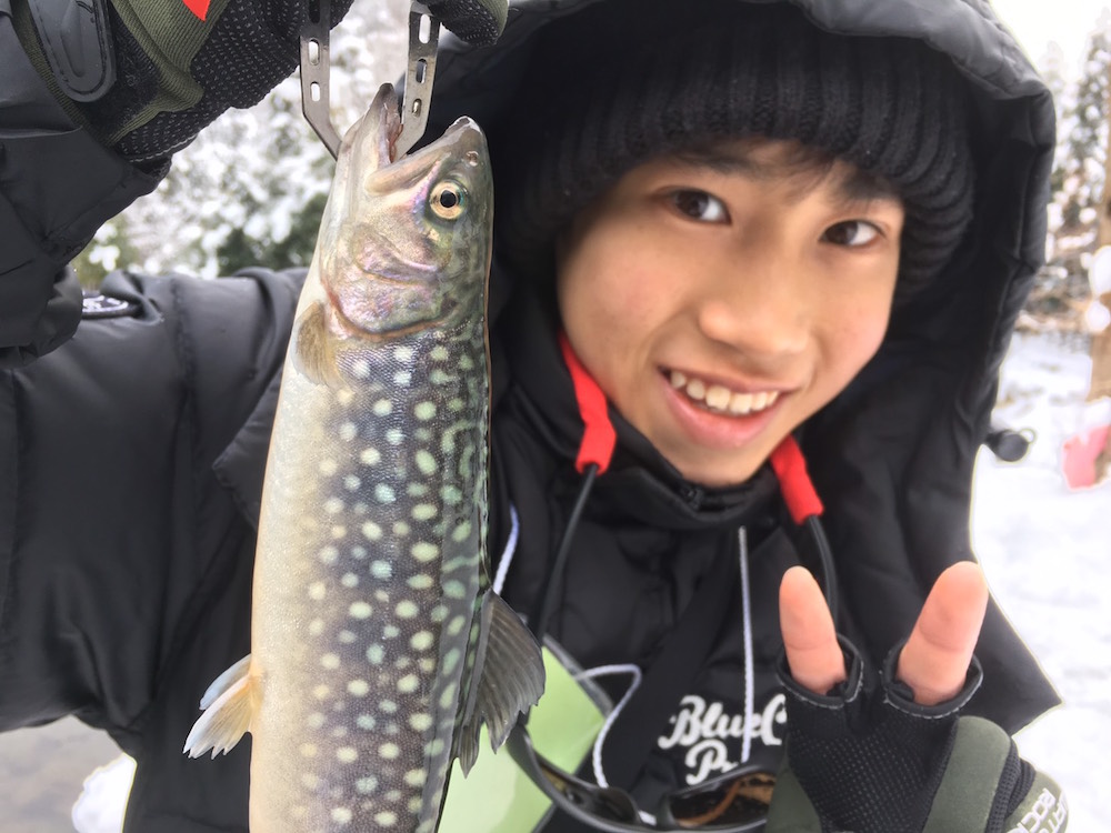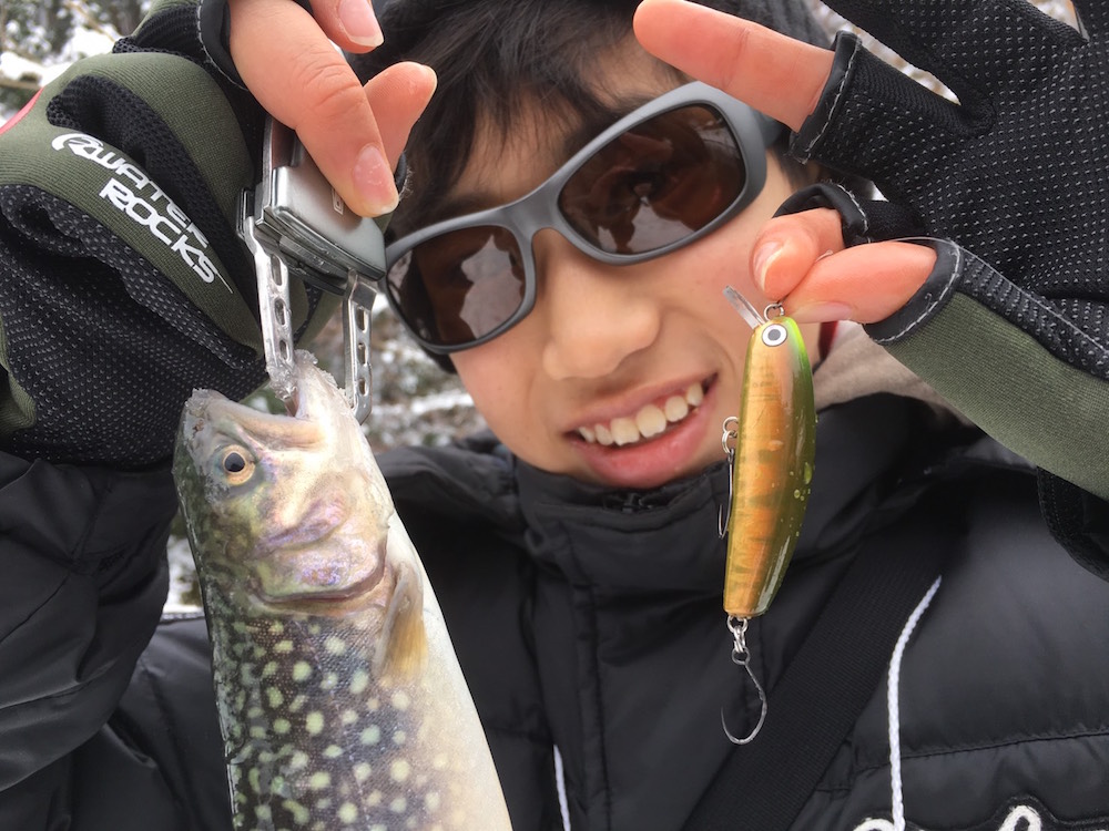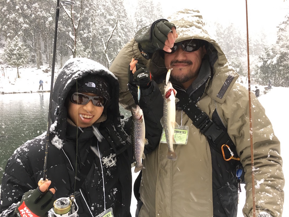 今年の初釣りを息子と準備して、天候の良さを祈って迎えた日は積雪情報と降雪予報。雨じゃなきゃエエわぃ!と朽木渓流魚センターさんへと向かいました。現地ではkanemaさんとカナ吉氏とも合流予定です。オヤジは「初釣りはこれで」と決めていたS45cwでスタートするも、追うが食わない渋い印象です。しかし、ひぃ君の方はkanemaさんの真似をしながらアクションさせて、同じS45cwでポロポロと釣り始めています。オヤジタックルのラインがリーダー8lbという(失くさないこと優先)第2ポンドでのマル秘テスト用チョイスでしたので、オヤジはそそくさと移動。マル秘の中層リトリーブを、流れ出しの脇にできるヨレるラインにタダ巻きしてニジマス3ヒット2キャッチ。同じくマル秘で色々と試してみますがヒットには至らず。それでも中層をシェイキングでギラつかせながら巻くと強い反応がありました。第1ポンドでリーダーを6lbに落としてやってみると追ってくる数が激増しました。その間に、ひぃ君が着実に釣っている(リーダー4lbフロロ)とのことで、後半はオヤジも溺愛のS45cwを楽しませてもらいました。しかし釣れるのは息子ばかりでオヤジ完敗宣言。カナ吉氏もkanemaさんも、ひぃ君に良い場所に立たせてくれていることに感謝です。結果ひぃ君はS45cwとsuming50cwで、イワナとヤマメ16fishの釣果となり、時折吹雪く雪景色の中でのみなさんとの釣りを堪能したようです。本人は「アクションを変えたり投げる方向を変えるだけで反応が変わって面白かった」と申しております。あの美しい里山の雪景色でダブルヒットの写真まで撮れて、オヤジは満足です。また、この日は我が親子の釣行を知って、同僚が息子さんを連れてやってきました。ミノーで狙っているのですが「全然釣れない」というのでS45cwをお貸ししたところ、44cmのイワナを釣り上げるというドラマがあって大変喜んでいただけました。ご一緒いただいた皆様、ありがとうございました。そしてサムルアーズ山岡さま、ユーザ仲間の皆様、本年もよろしくお願いいたします。