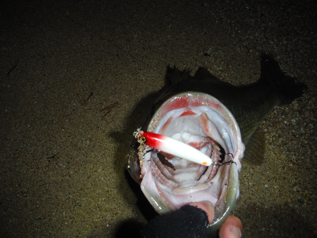 明けましておめでとうございます。年末に風邪をこじらせてしまい、今年こそと思っていた初売りにも顔を出せず残念な休みを過ごしておりました。もちろん釣りも3週間ぶりとなったわけですが、あいにくの雨と南からの強い風で全く釣れる気がしません。とりあえず数投様子を見て帰る気マンマンでしたが、思いと裏腹に開始早々からスラローマーがグーンと持って行かれ竿に重みが掛りました。久々やな~この感触、50ありそうやな~と余裕をかましているとフッとテンションが抜けバラし。ただ、バイト位置が沖7~8メートルくらいと結構手前だったので、今日はいけるかもと気持ちは次へと向かっていました。ルアーをSUM VIB 15Gにチェンジして数投後に案の定、ピックアップ寸前にゴゴンとバイト、しかし針掛かりしません。食いに来てる魚が数匹いてるようです。スラローマーに戻してゆっくり、ゆっくり、特に手前を意識して巻ききります。1投ごとにバイトの予感は高まり沖5メートルほどで待望のヒット。今度は逃すわけにいかないので、しっかり合わせて慎重に浜にずり上げると明らかに60を超える良型でした。バイトの数も位置も申し分なく、次が楽しみな釣行となりました。やっぱりフィールドへ出て投げてみないと分からないものだなぁと痛感いたしました。今年もどうぞよろしくお願いいたします。
