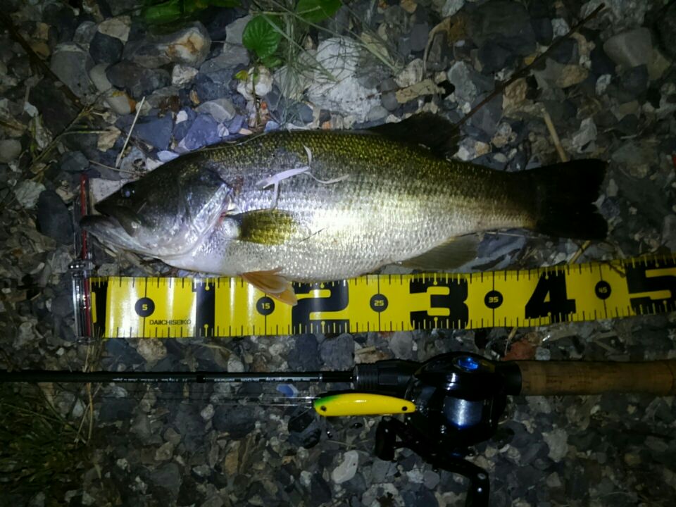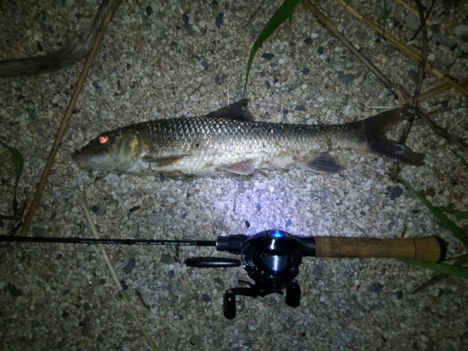 暑い夜でした。今夜は短期決戦だったので水温の低そうなポイントをランガンスタイルです。二カ所目でサミング70Fにヒットしたのはニゴイさん。早々に一匹釣ると気が楽になります。四カ所目でコトカスバナナを流れの変化に投げると、吸い込むバイト!ライトトリップ55Lをしっかり曲げてくれる47センチのバスでした。場が荒れたと思いましたが、サミング70SPを投げると、ゴンッ!とバイト。一気に左に走られライトトリップぶち曲がり!ドラグもズルズル出され、バスならランカー確定の引きです!数分は格闘してたと思いますが、寄ってきたは大物ニゴイ。釣り上げて計測したら65センチありました。その後は七カ所目でコトカスミディアムに水面を3回割ってバイトがありましたがフッキングしませんでした。最後のバイトの魚種が気になりましたが納竿しました。