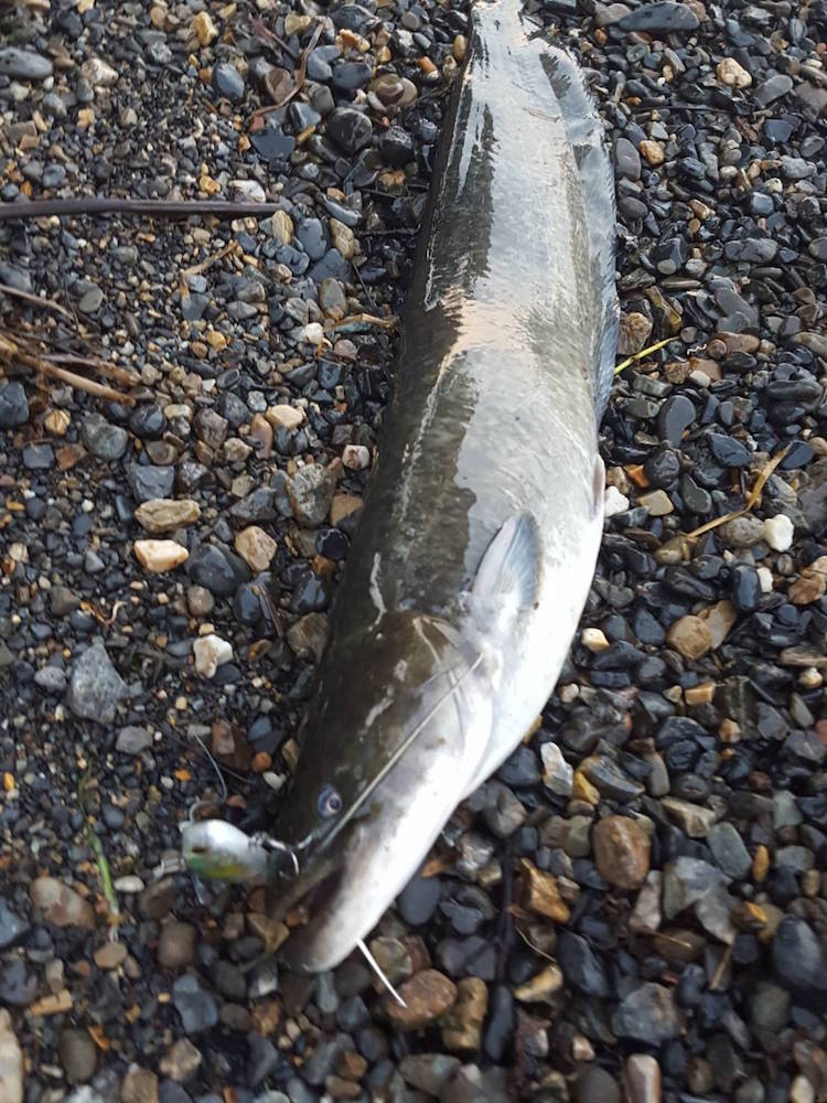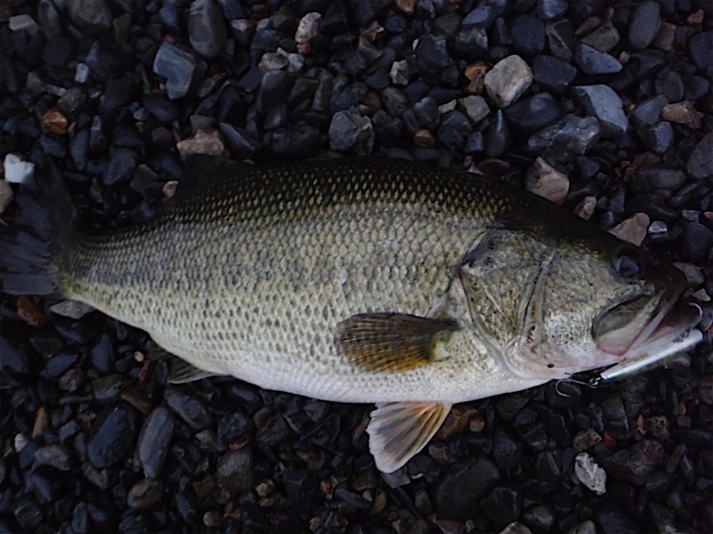 18時頃に風向きが北西へと変わる予報が出ていました。この時期にこの風を見過ごすことはできず、あてにできない予報をあてに出掛けました。到着した17時過ぎは穏やかで気配を感じません。とりあえず1時間ほどはベイトとウイード位置の確認に時間を費やします。そして、前回の釣行で見落としていたウイードを確認することができ目星をつけておきました。そうこうしているうちに、北西風が吹き始めて波立つと、いよいよ本気モード突入でフラッシュバックを連投します。うーん、出そうやのに全く反応がない。ならばとサムバイブSSを投入してやると、やっとこさのナマズさん。後は投げても投げても何もなしです。間もなく風が収まり静かな湖面に戻ると、もう釣れる気はしません。暗くなるまで惰性でキャストを繰り返し、残るポイントは、先ほど目星を付けていたウイードだけ。ウイードをかするくらいはサムバイブSSがピッタリはまります。最後だけは集中を取り戻し、一昨日の感覚がよみがえりイメージがわきます。ウイードを抜けたあたりでズドン。ほー、さっきは食わんで今ですか・・・。このバブルのおかげで日中でも勝負できているのが嬉しいかぎりです。皆さまの釣果と比べれば貧相ですが、負けないように頑張りたいと思います。