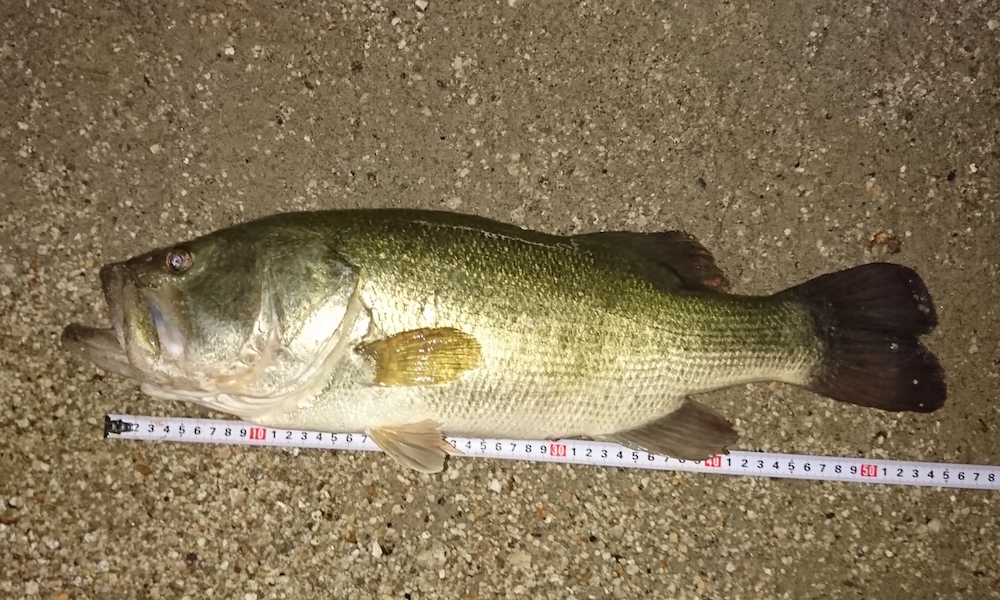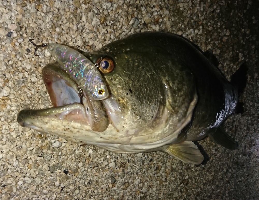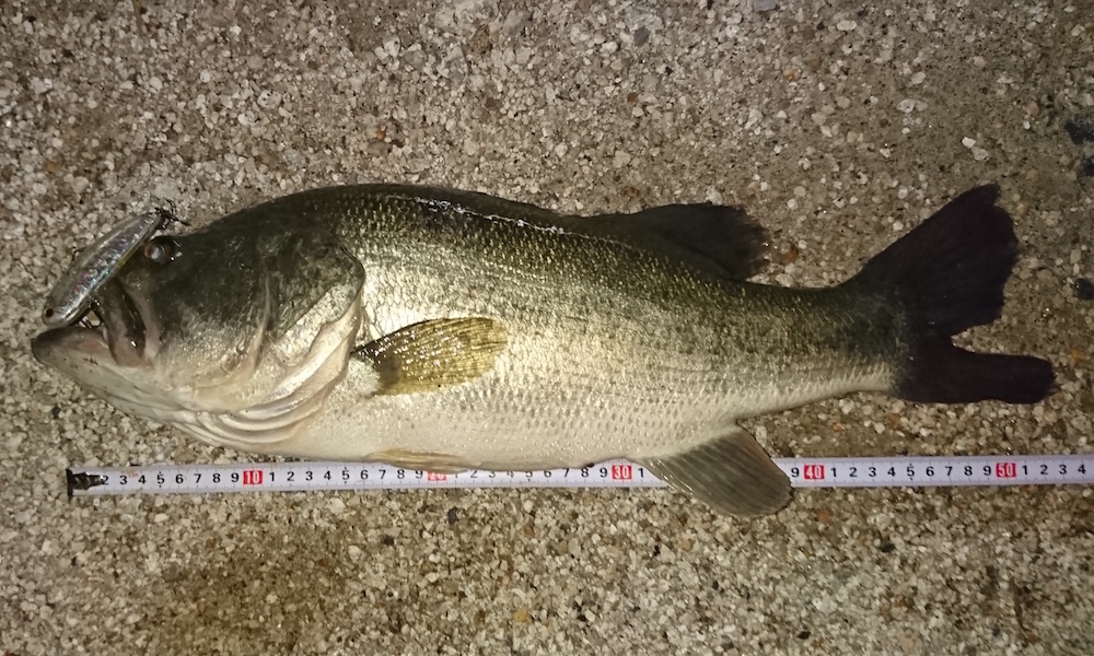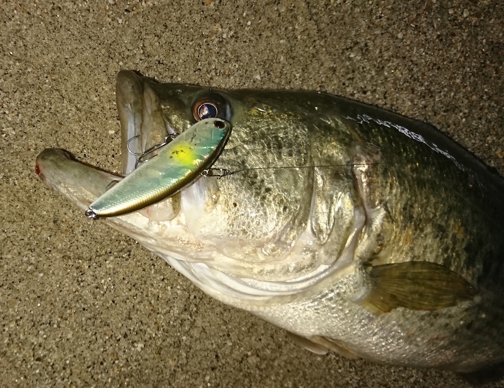 この日もSuming-70SPを投げたおすつもりでポイントに到着すると波と風で投げられず…。移動前にライトで水辺を見るとすぐ足元で「ギラリ」と光るバスの魚体。これをヒントにちょっと風裏になる二ヶ所目は岸から二メートル程をSUM VIBration 75Fで探ってみるとそこそこサイズが釣れ…バレました。がしかし、これは完全に寄ってるなと。三ヶ所目は波風強くSUM VIBration 13Gを選択。同じように、かつ早目に巻いてくるとガツン!とヒット。その後、波風が弱まってきたんでSSを流すと続けて二匹釣れました。SUM VIBration祭りでした!