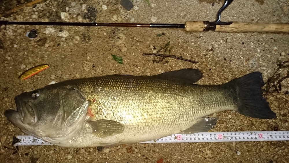 岩の上は不安定なので、立っていたらビックリしてドボンしているところでした。ランディング時なかなか顎に手が届かなくて困りましたが、踏んばって手を伸ばし伸ばして何とかキャッチ!今日もデカバスありがとうございます!この時既に満足はしてたんですが、釣るとテンションが上がって寒さをあまり感じなくなったので、他の気になる所も一応は探ってみようという気になりました。一旦車の近くまで戻り、ふと、ここら辺は先程Jr.では釣れなかったけど生命感は有ったのを思い出しました。今ならコトカスMで出るかな?と湖面がヨレている所を注意深く通してみると、40後半が一発で出てきました。写真は撮ってませんがよく引く良い体型でした。一匹釣って場を荒らしたかもしれないけど、まだ通してないコースも有るので念の為続けてキャストしました。するとヨレに乗った瞬間に、またアタリ即激走の強烈なヤツが!ドラグはそこまで緩めてないのにしつこく出されるので、沖に逃げたら巻くのを止めて竿を両手で持って横へ誘導し、横に逃げたら自分も逃げた方へ走りながら巻く!あと少し…というところで、どこから流れてきたのか捨てサーフボード?に魚が突っ込んでしまいました。ラインがボードの突起部?の隙間に挟まってしまい、巻くと異様に重いけどボードがこちらに寄ってきます。魚が外れたような感じはしてないので、ラインが切れないようにゆっくりゆっくりボードを岸に寄せると…ボードの下で観念したのかデカバスが大人しくなっていました。ラインが切れそうで危なかったですが、無事ボードごとデカバス仕留めました!サムルアーの釣りを始めてからもう何年か分からないですが、実はサムルアーで60UP釣るのは初めてだったりします。長かったような、そうでもなかったような…でも今まで使ったサムルアー達には、それまでの色んな沢山の思い出が詰まっています。その思い出は到底60UP一匹だけでは語り尽くせないです。坊主はその場では嫌だけど、思い出としては一番面白くて笑えますよね。良い思い出を沢山ありがとうございます。この後写真は撮ってませんがまた良い体型の40後半を追加して、他の気になる所へ。しかし全く反応が得られなかったので、車の近くに戻って最後の一投を繰り返しました。またまたアタリ即激走の魚が来ましたが、今度は捌き切れずフックアウト。ここで疲れて集中力が切れてまた寒くなってきたので納竿としました。今回で一区切りしましたが目標が釣り上がったので、行ける条件が揃ったらまたサムルアーを引っ提げて釣りに出掛けたいと思います。ひとまず、これまで楽しませて頂いてありがとうございました。そして、引き続きまたこれからも楽しませて下さい。よろしくお願いします。