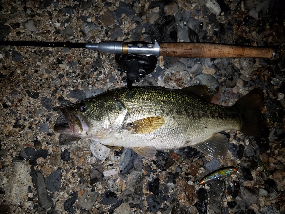 初めまして。Sがっちと言います。いつも皆さんのレポートを拝見させていただいてます。よろしくお願いいたします。先日某河口でサム山岡さんと、お会いした者です。その時気さくに接していただき、貴重なお話をしていただきました。釣りの時間をさいて申し訳ないとおもいつつ楽しい時間でしたのでついお話してしまいました。そのお話のなかで、ミディアムがいいよとのことがありましたので次の週の22日にコトカスミディアムを結び湖西の浜へ…湖流がきいてて釣れそうな気配もノーバイト。日が暮れてからはハッスンが遊んでくれます。湖面にうねりがでだしたので、コトカスミディアムプロップに変えます。しかし相変わらすハッスンしか釣れません。最後にあの流れ込みやって帰ろうと行くと先行者がいてはります。もう帰ろうとおもったら場所譲って頂きました。そして流れの馴染むちょい冲にキャストして2.3巻きでコンと来てロッドに重みが…ジャンプもせえへんしニゴイかとおもい浜にずりあげると何か平たい魚。ほどよく肥えてキレイな魚体のバスでした。夜空にはお月様がでています。やっぱり自分は月夜と相性がいいようです。