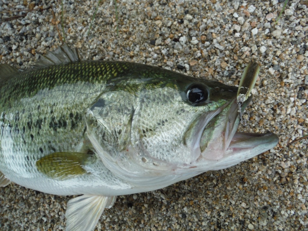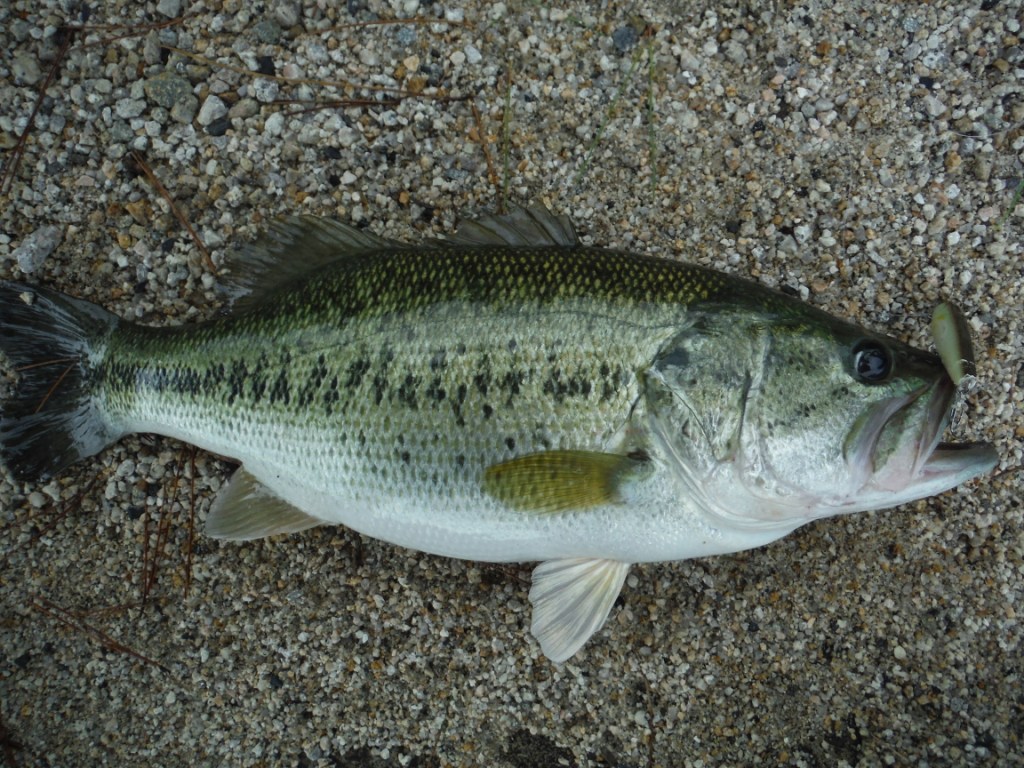 台風が接近していましたので影響の少ない午前中に出掛けました。前回と違いやたらとアユの群れがいます。沖の群れには40センチくらいのバスが飛びついているのが見えますが、到底届く距離ではありません。浜をフラッシュバックで流しながらボイルを探します。行き過ぎたところも、今から進むところもキョロキョロです。狙うエリアの中盤をすぎたあたりで、先程までキャストしていた浅瀬で大型と思われるボイルを発見。慌てて30~40メートルほどの距離を戻り、座りながらフラッシュバックを軽くキャスト。スーチョンチョン、一発で吸い込んでくれました。掛けてからの走りは、右に左に一気に持って行く俊敏系で十分にファイトを楽しむことができました。