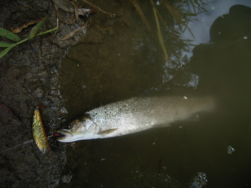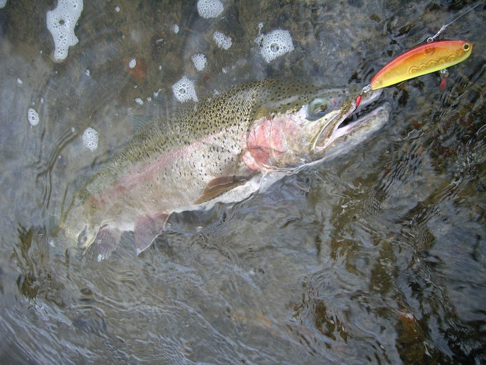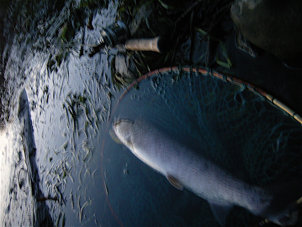 北海道って、釣り人の天国なんです。毎年、終ってみれば「今迄で一番面白かったな~」と感じる終わりのなさが、僕には地獄としか思えません。今回はお目当ての川の上流部から沿って行くルートを取り、連休で叩きに叩かれたであろう大場所へ。出発前になんとか入手出来たsuming-50cwで、この川のデカニジ様を・・・なんですけどね、立ち位置取ってキャストしてアレ?なんで13G?。たぶん本能みたいなもんです。3投で、かな?。と1・2投目でトレースラインを変えてチラ魅せと即撤収、3投目で深場からの押し上げる水流を使ってちょっと脱力した上昇ヒラリ~ン、の途端にグッイーーーンとヒット。バイトと動きでニジ様確定。動きからして男子?ちょっと姿見せてもらいましょう。君はなんでそんなにレッドバンドを見せつける様なジャンプをするのかね?。寄せると、あぁ嬉しいな、僕が釣りたかったタイプの魚でした。その後川に沿ってどんどん進み、道具の使い勝手を思い出しがてら川の様子を拝見して差し支えなければ釣れてくれると尚よろしいが・・・「水を下さい」。行く前から分かってましたよ。枯れてるがな、と。しかし、水が少ないという事はその分このデッカイ川のポイントが絞り易いという事であり、これは貰ったも同然であり、なおかつ水も澄んでて晴天続きで・・。ええ、最高に気持ち良いです。普段は川底なのに、テクテク歩けるんですから。去年良型釣った場所もすっかり陸地で、草花生えて来てるし。干上がった川底から岸の地形を見上げながら「去年あそこで出したよな~」と思い出に浸り・・・ません。過去、もっと水が無かった時もありましたから。そして遂に・・・うぉわぁ釣れたぁぁーー!!ヤッタ!ヤッタ!!道北の大河で1年ぶりに釣れた!。32cm。小さいですか?。ここから階段を駆け上がる序章です。勢い付いた翌日、水垢で腐臭のする河原でフテ寝。この辺りは夕焼けがとても美しいんですよね、16~17時頃が特に。オートキャストロボットの様に流芯に投げちゃ引きを繰り返しながら、美しいこの光景をぼくは今一人占めにしてい・・・うわぁ掛かったぁぁぁビックリしたぁーー!60cm。もうちょいやってみよ。もう1匹居たーー!!75cm。お、おい、1匹ごとに大きくなってるぞ、次どうなるんやろ・・?。翌日、全く違う場所にて60cm。・・・アレ?。という感じで序盤戦終了でした。