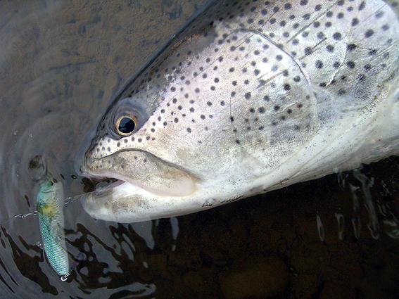 る途中の木片、更に変質が進んだ物、石炭化したもの、鉄鋼石が露出した地帯その他、あとは15cm程の子魚が居る環境etc...。滑ってドデーンとこけると岸際や倒木下からビュッと逃げる魚影もありますが、水位が低いので戸惑っており、まばたきして一瞬目を離すともう見当たらない。ハテ幻でも見たかな?。「やっぱり遥々本州から来るのは、”幻の魚”を釣ってみたいからですか?。」と頻繁に話し掛けられるのですが、僕の場合はどう答えていいのやら・・・。川探検の際は当然釣りながらなのですが、今年嬉しかったのは突然70cm程の子が掛かったと思ったら、ほとんどその場で悶えているのでラインテンションを保っていると、激しくローリングし始めた事です。「全然引かない」「ローリングする」「すぐ寄せられる」という通説と理由が、澄んだタンニン色の水中でよく見えます。で、どうなるの?。そのままにしているとポロッと外れてなるほどな~、と感嘆。又、餌釣り師の方が生き餌を投入しているのに全く反応せず対岸に泳いで行ったと思ったらウグイを追っかける大型個体を見ていたり。という様な事をしていたのが序章(?)の合間の事です。なんだそりゃぁ、という御意見もっともですが、なにぶん毎年ゼロからのスタートなもんですから。ではそろそろ元の川に戻ってギアを上げて行きましょう。そもそも数釣りとは無縁な河川・時期なので全ての魚が感慨深いのですがその中でも印象に残っているのは、同じ地点で2日に分けて、ヒットと同時に高速魚雷の様に流芯を疾走したSUM VIB 15G好きな暴走夫婦(♂・♀)でしょうか。モンスター級、という訳ではないんですが、ヒレが発達しているからかドラグ臨界、ホントに止まらないし跳躍するし諦めないリトルジャイアント。渇水を逆手に取って釣れたという事もあり、どちらも記憶に残る魚でした。助走OK、トップギアへ。出発前まで流れの中でFat sumを爆走させる訓練をした甲斐がありました。逆波立つ流れの中で閃光が全身を翻して空中から水面へと躍り掛かる光景を見たいが為の選択ですが、状況に合わせた最良の選択であった筈です。Fat sum・FLASHBACKの合わせ技に加えて奥技SABEL SUM Jr.と言った所でしょうか。上よりも下ならばとSUM VIB。場所やその日の雰囲気に合わせてウェイト微調整必須。フックサイズで変わる動作特性に要注目。フォール速度は速い方が良いのか?それともスーパースロー?ボディ振幅のピッチは?。夢中の時間はユルりと流れて、そろそろ閉幕が近付いて来たのでありました。