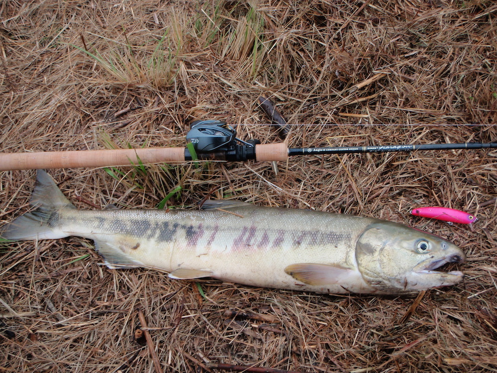 サムさん、社員Aさんこんばんは今回は福島県南相馬市で真野川サケ有効利用調査に当選したので行ってきました。今年は3日間の調査でしたが私は仕事の関係で初日のみ参加です(初参加)。調査時間は7:00~12:00。スタートと共にキャスト開始。周りはアルミ製軽量スプーンにタコベイト装着に巨大ウキを投げてゆっくりゆっくり巻いていましたが、京都人は手持ちの京都産ルアーをあれこれ投げる。けれどもアタリがツンと超甘噛みでおまえらヘラブナか!と悪戦苦闘。鮭って河川に入るとエサ食べないのですが海のときの習性で目の前に獲物が来たらパクッといっちゃうそうです。2時間経過し引潮で流れが出てくると周りで釣れ出すが私は・・・あまりにフッキングしないので最初テールに針を付けていたのですがベリーに変更。コトカスミディアム桃色のただ巻きでツンと来て、ここであわせたらアカンアカンと自分に言い聞かせググッときたところで巻き合わせ。フッキング成功!グイグイと引きを楽しみながら上がってきたのは63cm・2.2㎏(現場のスタッフの方が計測してくれます・写真も撮ってくれます)鮭としてはそんな大型ではなかったけれど尖った鼻のオスでした。結局この1匹でしたが大好きなルアーで初魚が釣れたんで大満足。規則でシングルフック1本しか装着できないのでルアーのバランス悪くて苦労しました。でも本州で河口付近(2kmぐらい)を開放して陸から堂々と鮭釣りできるのは真野川ぐらいと言ってました。なかなか貴重な経験でした。南相馬市は東日本大震災・原発事故で大変な被害にあった地区ですが復興はまだまだって感じです。でも雨の中スタッフの皆さんが釣り人に楽しんでもらおうと手弁当で一生懸命尽力されていて感激しました。当日、プラグで釣ったのはたぶん私だけ(な筈)。調査結果は48人参加で69匹と激シブでしたが面白かったです。興味のある方は真野川サケ調査でググッてみて下さい。ではまた。