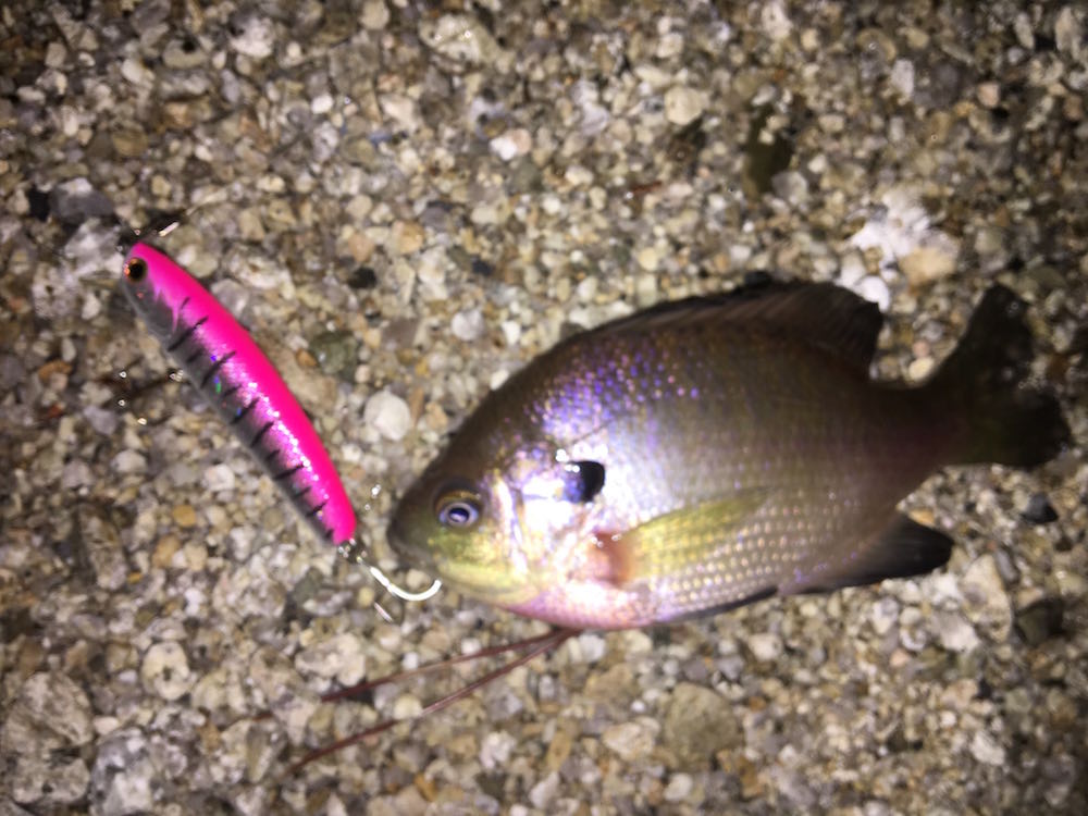 さらに投げ続けていると今度はオリジナルサミング70SPにモゾっとアタリ。掛からんかったーと思ったら、こちらも久しぶりのギル。こんなのが釣れると思っていませんでした。今度はこれを狙っているサカナを釣りたいので、また行ってみます。