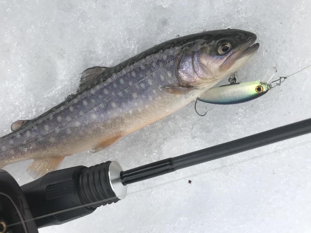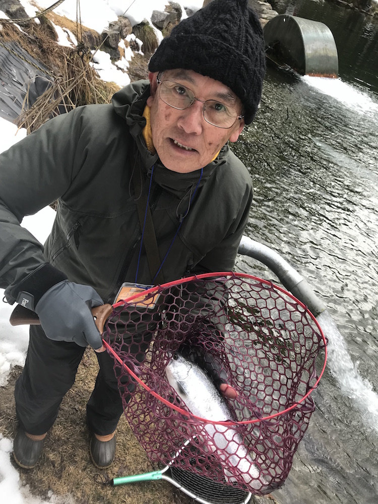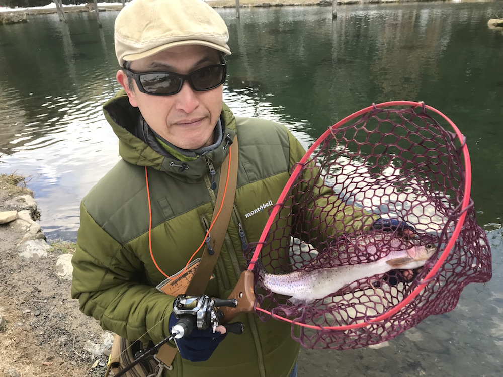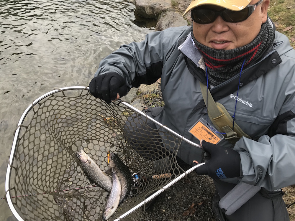 久しぶりにユーザーさんと集うエリアフィッシングに行って参りました。メンバーは我々とレポートでお馴染みの方々。毎度のkanemaさん、saddaさんをはじめ、カナ吉さん&ミワちゃん、シンボーさん。急遽不参加が決まったメンバーもおられたのは非常に残念でした。いつもの事ですが、和気藹々のつもりが各自会話も程ほどに気難しいトラウト達の攻略に必死のパッチでした。取り敢えずはミノー(S45cw&suming-50cw)主体でイワナを狙ってウォーミングアップのつもりでしたが、そう簡単には釣れてくれません。ポンポ〜ンと格好良く釣り上げて、アクションのコツ教えましょうか?なんて言うつもりが、隣でシンボーさん3連発とか・・・僕(社員A)の立場が無いんですけど。ホホ〜やりますね〜とか言いつつコッソリとウェイトセッティングなんぞを盗撮。どうやらシンボーさんはリップとベリーアイの中間辺りにウェイトを追加しておられました。このセッティングで終始魚からの反応があった様なので、皆さんも参考にしてみては如何でしょう。因みに僕はベリーアイを中心にウェイトを追加しスローシンキングに調整しています。いつも思うのですが、これがベストというのはなかなか無く、その日の魚のコンディションやタックルバランス、アクションのリズムが関係してくるので、自分に合うスタイルを見つけるのが良いと思います。そして気になっていたのは釣りガールミワちゃん。S45cwでとことん押し通してくれました。この日は必ずしも調子が出ていませんでしたが、デカイワナをバラしたりもした様で、残念だったね〜。寒い中5時間以上釣り続けるだけでも相当だと思います。お父さんは慣れたもので3魚種(イワナ、ニジマス、サクラマス)達成の実力。教えてもらってスキルアップして下さい!さて、サム山岡の方は○秘テストを繰り返していましたが、今回は良型サクラマスをキャッチするなどしましたが、もう一息ってところだった様です。フィールドに向き不向きがあるので致し方ないかなと。さて、次は何処でテストしようかな?