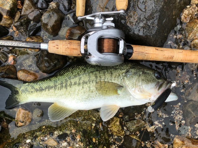 ご無沙汰しております。このところ公私ともにバタバタしており、なかなか釣り場へ向かうことができなかったのですが、友人に誘って頂き、レポートを賑わせている琵琶湖へ出かけました。予報は大雨でしたが、朝起きたら雨は降っておらず助かりました。しかし到着した最初のポイントはかなりの強風!なるべくキャストしやすい場所へ移動しつつもノーバイト!続く2箇所目は風はマシでまぁまぁ釣れる気配は漂っておりましたが、ニゴイのチェイスがあったのみ。小移動して1投目のただ巻き2巻目にグンと重くなるバイト。先程のチェイスもありニゴイ君かと思うような引きでしたが、目の前でジャンプ!バスー!なんとか久し振りにハードルアーバスを手にできました!このレポートでは皆さんかなりの大物を投稿されているので、少々恥ずかしいですが…久し振りで嬉しかったので投稿させていただきます。