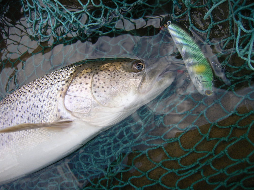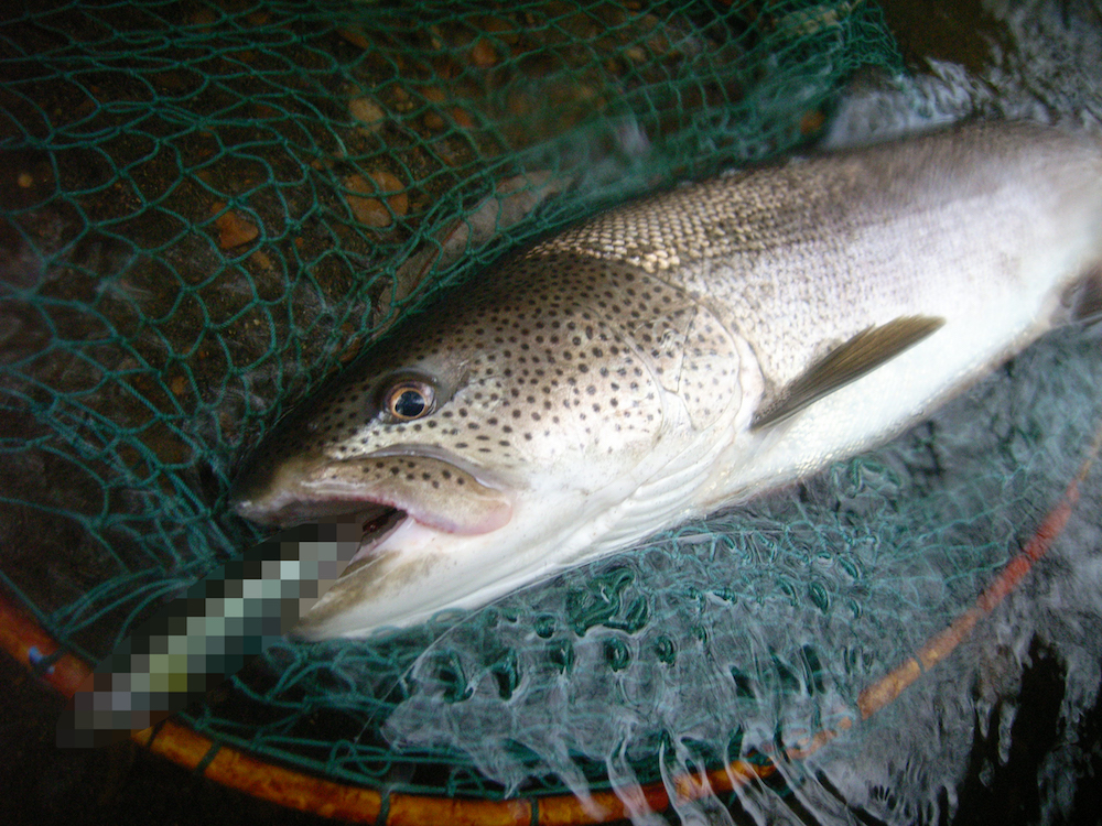 北海道に行って来ましたー!、1ヶ月程前に。程よく記憶が薄れて来たので塞がりかけた傷口をほじくり返してみたいと思います(理由後述)。上陸して道中一時停止してデカニジや太アメマスで肩慣らし・・・が、目当ての流域は台風の中途半端な雨で若干増水+泥水。さらばニジ・アメ、遊んでる暇はないのだ。さて今回は、「+20」にトライの巻。その前に「+10」の壁があるのですが。「+5」辺り迄は割と居る様な・・・ちなみに大きさの話です。今年の場所とタイミングを特定するのに掛かりそうな時間は計上済みなので初日から冷静に臨みました。水が少なくて高水温+泥~っとしてイヤな水色の川に。あかんこれはお手上げ状態どうしよう?。もう1つ忘れてました。今回は新規場所で釣る自己お題。なんの苦行やろかこれは~、と歩き倒しますが定位しているのが見える個体も絶好の位置でバイトする個体も、今年の全体的な水量不足を反映してか、狙いの型がおりませぬ。気分転換に有名河川に行ってみると、メジャーポイントではない辺鄙な所にて70~100クラスが数匹単位でゆっくり移動中。何匹かは針傷も見えます。スケベ心全開であれこれ繰り出すもののさすがにこれは無理か、と思ったらコトカスミディアムプロップに3回だけ反応しました。スケベ心が治まらず、河口付近(規制範囲外)にて○秘の操作につい手心を加えると予想通りシロザケが来ました。ひょっとして6年魚?という大型だったのでヒーコラ耐える羽目になり、掛けてから大層後悔しました。本拠地の川に戻りシロザケを避けるべくSABEL SUM Jr.を投入するとまたシロザケが。トップに出ないで下さい。○秘にもクワ~~~ッと口を開けて銜えるのが見えましたがライン緩めて回避。今年はシロザケの回帰が数年振りに回復した上に大型揃いなので瀬のポイント丸潰れ。日没前、深く掘れた箇所の周囲を探っても何も起きず、こんな事したらどうなるかな?と腕を上げてコトカスミディアムプロップを水を噛む様な噛まない様な微妙な引き具合でブレイクのエッジの水面を滑らせていると「ボガン!!」と大爆発しました。心臓が飛び出ました。掛からなかったので次の日もやってみました。何も起きませんでした。違う日にもっと流れが速い場所でもう少し漂う様にすると、ヘッド&テールで飛び出しました。しかし勢い良すぎて飛び越されました。さて、「○秘でウチダザリガニ自己記録更新」「15Gで鹿角が釣れた」「投げたすぐ来たすぐバレた」等々どちらでもいい事が続くのですが、とにかく釣れん・・・。数釣りゃ出せる作戦禁止で、ほぼ1河川・狙いのサイズに絞ってのキツい年。残り時間を気に仕掛けた頃、リトリーブしていたSUM VIBをここら辺りか?と底で立った状態で割と長く静止、軽くヒラ打ち後のリトリーブで「カッ」と小さい感触にアレ?これは・・と感じた瞬間にどすこいヒット。首振りあまりせず。リフト出来ず。・・・これ雄のアカン子や、しかもパツンパツンで図体大きい、狙いの奴っぽい!!、底をズイズイ~~ッと勢い良く沖へ一直線、止まっ・・・てくれへんの?。・・・そら針外れますよ。と、まぁ逃した魚は多かったのですが・・・つづく