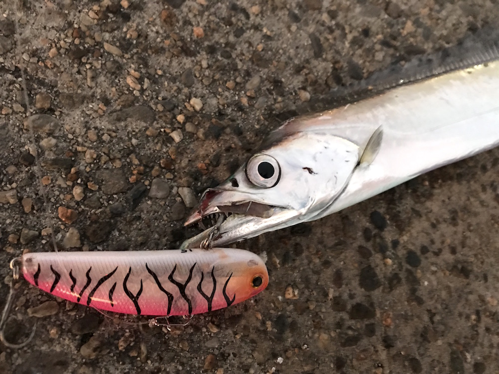 一年ぶりのカモメ大橋。フィールドには相変わらずの人なつっこいアングラーが集まっておりました。その中にはレポートコーナーで皆さんもご存じのTO氏が!すっかり溶け込んでおりましたわ。状況を効くと夜明け後が良かった様で何と○秘でも釣ってくれたそう。半分肩の荷が下りた状態で、日暮れ時までゆっくり海を眺めつつ準備に取りかかります。水平線に沈む夕日を眺めながらそろそろ釣れるかな〜と、ここでは安定感抜群のサムバイブ15G。一人また一人と釣れ始めた中、自分にも明確なアタリ!特にテクニックとかは使う必要なしの運次第、ルアー次第、沈めてから只巻くだけ。続けてもう一本。気の利いた写真を撮影しようにも、人なつっこいおっちゃん達が寄ってきて立ち話。結局写真は一枚しか撮れませんでした・・・さて、ここからが今回の本命“○秘で太刀魚”ですが、2回良いアタリを逃してしまいました。ルアーの特性からして立ち位置が水面に近くないと使い辛いので、ポイントも限られる中でしたがしっかりと反応を得られました。もう少し条件が揃っていれば、もっと簡単に結果が出る様に感じます。それにしても2回目のアタリではラインもささくれて危うく○秘をロストするところでした。