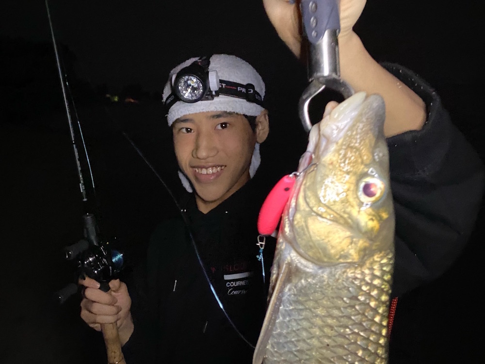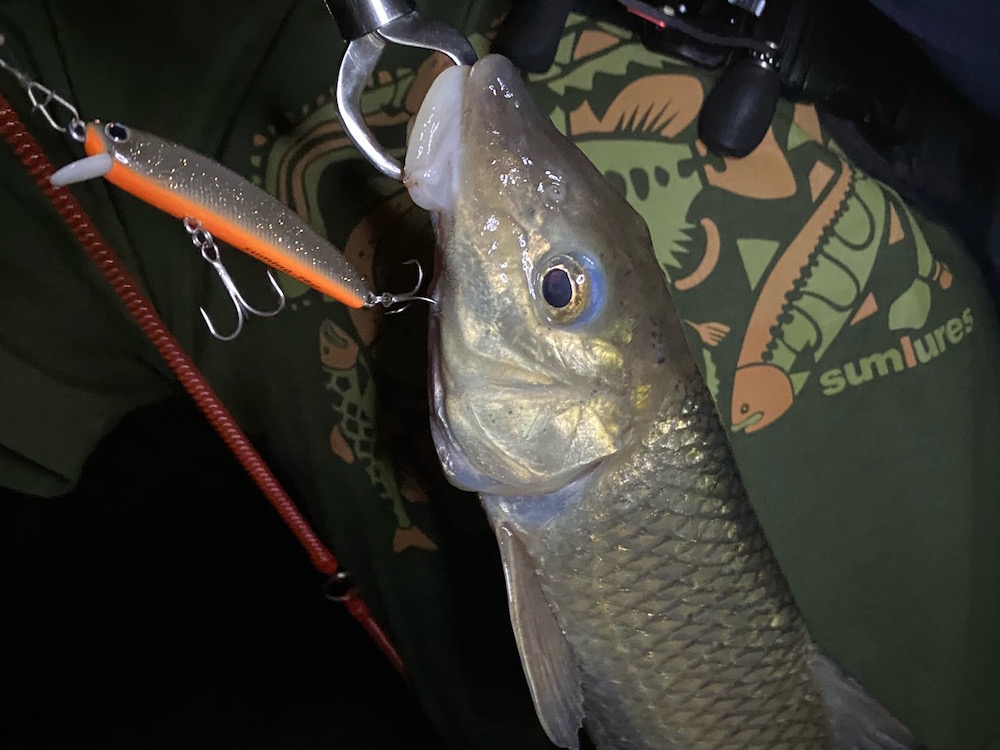 久しぶりに親子釣行できました。中型ニゴイを1尾ずつ、新しいサミング70SPで釣りましたがあたりは何度も。全部ニゴイかなとの印象でしたが、久しぶりに行けた琵琶湖の夜は風も吹いて心地よかったです。満月の曇りですが、薄雲で明るい時間も多くある日でした。新たにラインナップされたプラグで楽しもうと堪能してこれましたが、また様々なポイントを見て周りたいと思います。浜辺に飛んでいたホタルをつかまえてリールに乗せると、しばらくの間ベイトリールのあちらこちらを巣のように歩きまわって釣りができないという思い出のおまけ付きで、やっと行けた琵琶湖での出来事としては上々かと思います。なお、ボーン素材になったsuming-70SPにはシールオモリ(マットピンク)と、ベリー6番(ブラックフィッシュOB)で水平に近い姿勢で重さを足して試してみました。ただ巻きでもロールアクションのキレが強くなっている様でしたが、どうなのでしょうか。また使い込んでみたいアイテムですね。