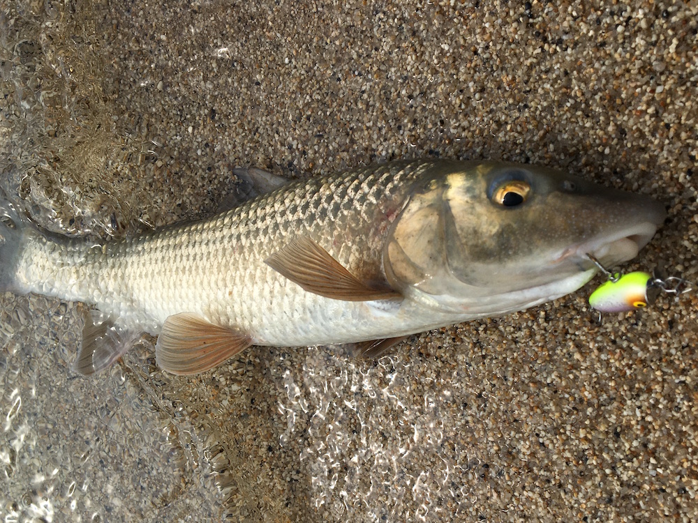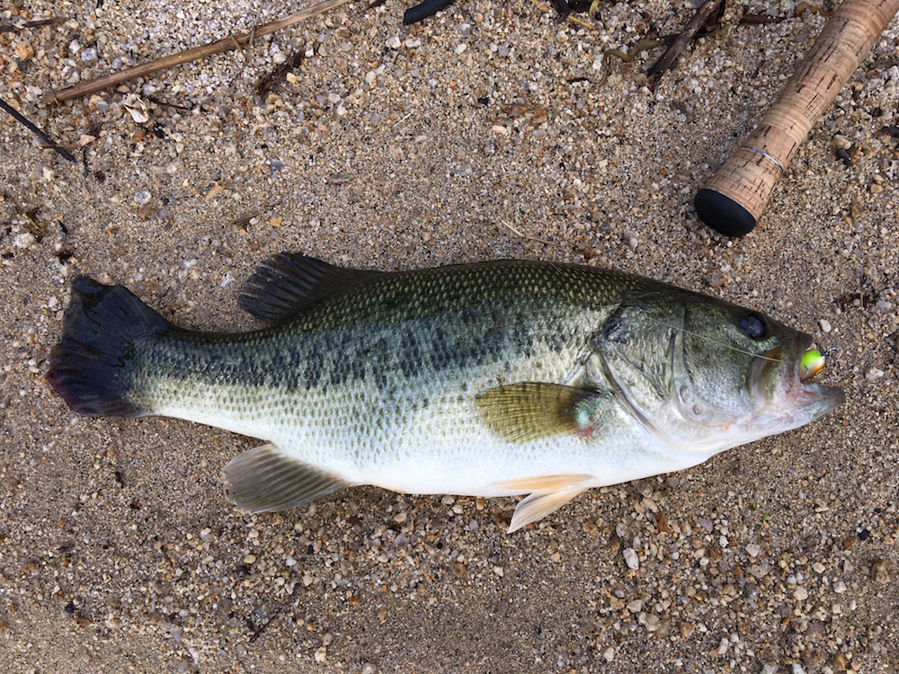 失礼致します。行きたくてうずうずしていましたが、移動自粛解除ということで早速行ってきました。夜明け前に現着したかったのですが、早朝に開いているガソリンスタンドを探すのに手間取ってしまい、お日様が登ってからのスタートです。水中を覗いて見ますと、コアユはたくさんいますがまとまりのない感じで散らばっています。沖ではアユ取り船が黒い煙を吹いていますので、沖に行ってしまった後かも知れないと思っていると、40クラスのバスを目撃。居ることが分かってやる気が出ますが、単体でしたので難しそう。それでもと期待して水面を探りますが、そう易々とは出てくれません。ならば新アイテムのプロップドロップ(細軸#10に変更)。可愛い体躯に似合わず、風に向かって投げてもよく飛びます!竿の高さを変えながら、巻いているとコンとアタリ。ハスかな。しばらく岸平行気味に遠投し偶にラインテンションを抜きながらリズムよく巻いているとゴンと先程とは違うアタリ。グングンと頭を振るのでバス確信。小さいルアー特有のやり取りの緊張感もまた良しです。しかし、プロップドロップ、面白いルアーですね。タナが合えばクルクル巻いているだけで釣れてしまいそうな感じです。また行ってみます。
